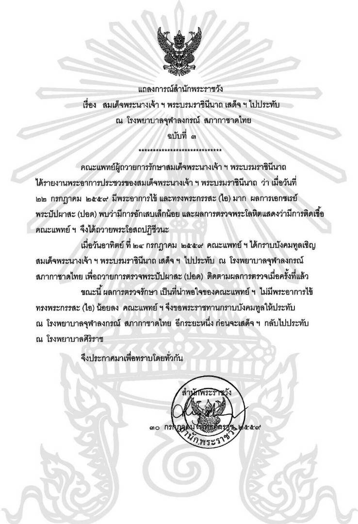 ข่าวในประเทศ สำนักพระราชวังออกแถลงการณ์ ฉบับที่ 3 ระบุว่า เมื่อวันที่ 24 ก.ค. 2559 คณะแพทย์ฯ ได้กราบบังคมทูลเชิญสมเด็จพระนางเจ้าฯ พระบรมราชินีนาถ เสด็จฯ ไปประทับ ณ โรงพยาบาลจุฬาลงกรณ์ สภากาชาดไทย เพื่อถวายการตรวจพระปัปผาสะ (ปอด) ติดตามผลการตรวจเมื่อครั้งที่แล้ว ขณะนี้ผลการตรวจรักษาเป็นที่น่าพอใจของคณะแพทย์ ไม่มีพระอาการไข้ ทรงพระกรรสะ (ไอ) น้อยลง […]