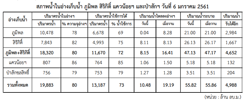 ปริมาตรน้ำใช้การได้ใน 4 เขื่อนหลัก (เขื่อนภูมิพล เขื่อนสิริกิติ์ เขื่อนแควน้อยบำรุงแดน และเขื่อนป่าสักชลสิทธิ์) อยู่ที่ร้อยละ 73 หรือ 13,187 ล้านลูกบาศก์เมตร สูงกว่าวันเดียวกันในปีที่ผ่านมาถึงร้อยละ 23 โดยปัจจุบันมีการระบายน้ำที่ 43.36 ล้านลูกบาศก์เมตรต่อวัน คาดการณ์ว่าจะมีน้ำเพียงพอให้เกษตรกรใช้ทำการเพาะปลูกได้ตลอดฤดูแล้งนี้