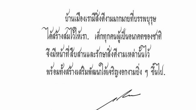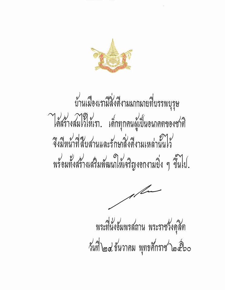 - สมเด็จพระเจ้าอยู่หัวมหาวชิราลงกรณ บดินทรเทพยวรางกูร พระราชทานพระราโชวาท เนื่องในวันเด็กแห่งชาติ ประจำปี 2561 ความว่า “บ้านเมืองเรามีสิ่งดีงามมากมายที่บรรพบุรุษได้สร้างสมไว้ให้เรา เด็กทุกคนผู้เป็นอนาคตของชาติจึงมีหน้าที่สืบสานและรักษาสิ่งดีงามเหล่านั้นไว้ พร้อมทั้งสร้างเสริมพัฒนาให้เจริญงอกงามยิ่งๆ ขึ้นไป”