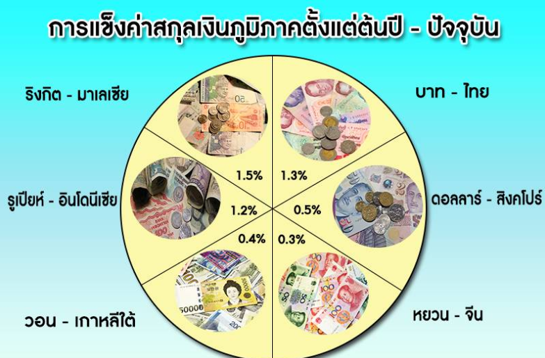 - ประเทศไทยค่าเงินบาทแข็งค่าสูงสุดในรอบ 40 เดือน นับจากเดือน กันยายน 2557 เนื่องจากมีเงินทุนไหลเข้ามาในตลาดเกิดใหม่ รวมทั้งไทยอย่างต่อเนื่อง เพราะคาดการณ์ว่าเศรษฐกิจในภูมิภาคนี้มีแนวโน้มที่ดีกว่าเศรษฐกิจในภูมิภาคอื่น ส่งผลให้อัตราแลกเปลี่ยนโดยเฉพาะเงินบาทแข็งค่าขึ้นถึง 1 บาท จาก 33 บาท มาเป็น 32 บาท จากช่วง 2 สัปดาห์ที่ผ่านมา โดยที่การแข็งค่าของสกุลเงินในภูมิภาคนี้ตั้งแต่ต้นปีจนถึงปัจจุบันพบว่า เงินริงกิตมาเลเซีย 1.5% บาทไทย 1.3% รูเปียห์อินโดนีเซีย 1.2% ดอลลาร์สิงคโปร์ 0.5% วอนเกาหลีใต้ 0.4% และหยวนจีน 0.3%