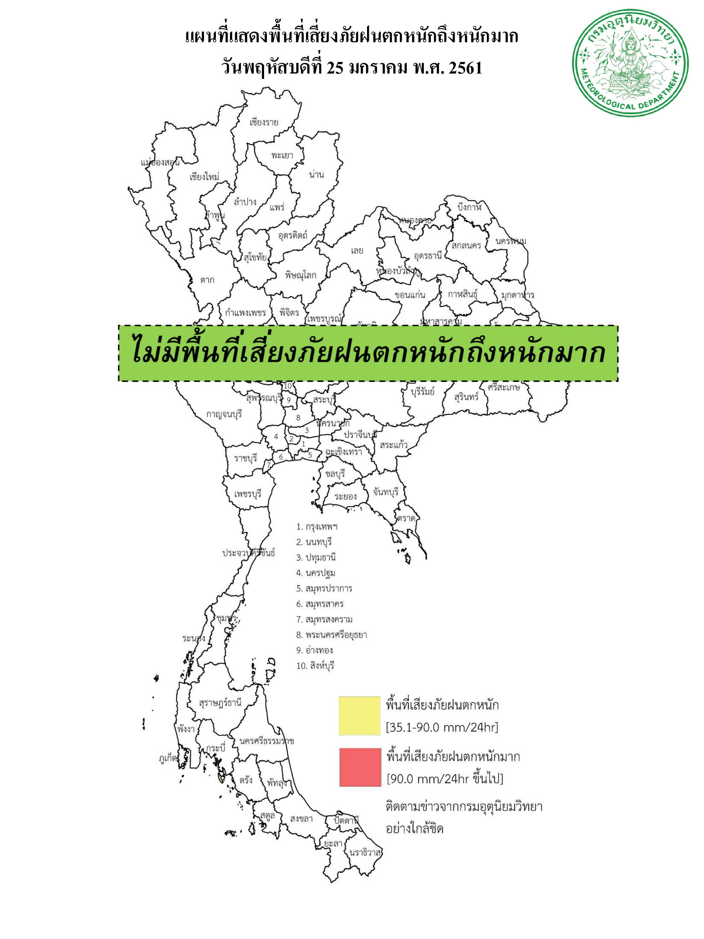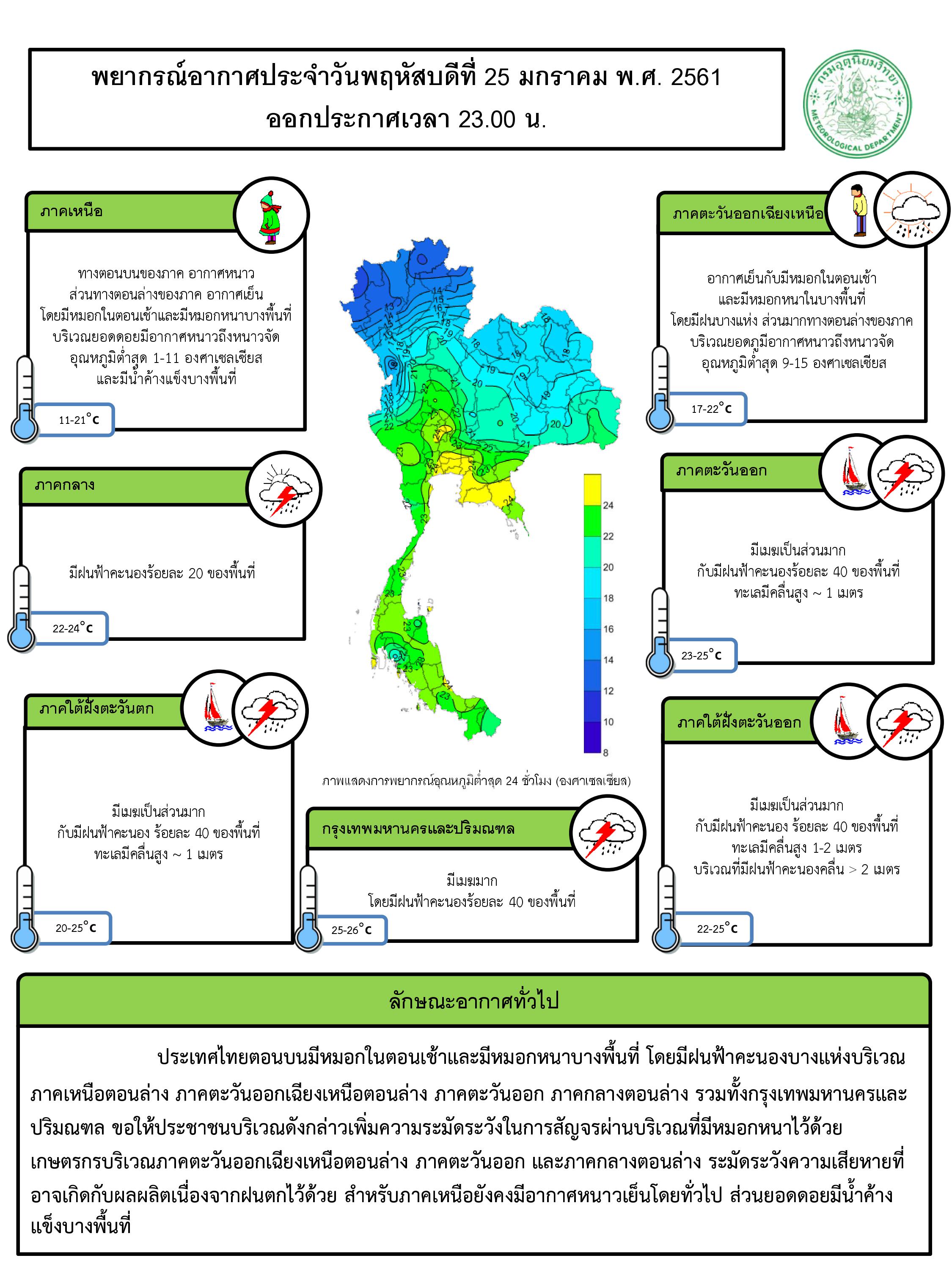 - ประเทศไทยตอนบนมีหมอกในตอนเช้าและมีหมอกหนาบางพื้นที่ โดยมีฝนฟ้าคะนองบางแห่งบริเวณภาคเหนือตอนล่าง ภาคตะวันออกเฉียงเหนือตอนล่าง ภาคตะวันออก ภาคกลางตอนล่าง รวมทั้งกรุงเทพมหานครและปริมณฑล ขอให้ประชาชนบริเวณดังกล่าวเพิ่มความระมัดระวังในการสัญจรผ่านบริเวณที่มีหมอกหนาไว้ด้วย เกษตรกรบริเวณภาคตะวันออกเฉียงเหนือตอนล่าง ภาคตะวันออก และภาคกลางตอนล่าง ระมัดระวังความเสียหายที่อาจเกิดกับผลผลิตเนื่องจากฝนตกไว้ด้วย สำหรับภาคเหนือยังคงมีอากาศหนาวเย็นโดยทั่วไป ส่วนยอดดอยมีน้ำค้างแข็งบางพื้นที่