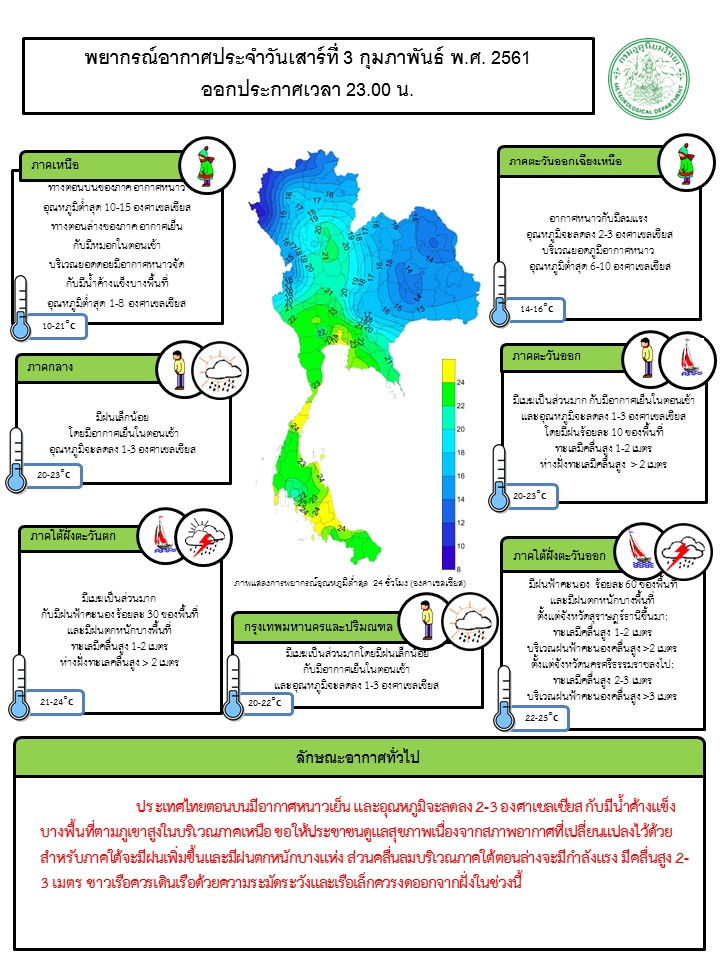 ประเทศไทยตอนบนมีอากาศหนาวเย็น และอุณหภูมิจะลดลง 2-3 องศาเซลเซียส กับมีน้ำค้างแข็งบางพื้นที่ตามภูเขาสูงในบริเวณภาคเหนือ ทั้งนี้ กรมอุตุนิยมวิทยาได้ออกประกาศแจ้งเตือนประชาชนให้ได้ทราบว่าจะมีอากาศเย็นปกคลุมประเทศไทยตอนบนและบริเวณภาคใต้มีคลื่นลมแรงในช่วงวันที่ 3-8 กุมภาพันธ์ 2561