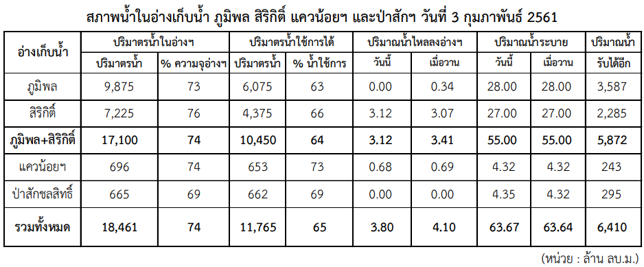 สถานการณ์น้ำอยู่ในสภาพปกติ โดยอ่างเก็บน้ำภูมิพล สิริกิติ์ แควน้อยฯ และป่าสักชลสิทธิ์ ซึ่งเป็นอ่างเก็บน้ำหลักในพื้นที่ลุ่มแม่น้ำเจ้าพระยา มีปริมาตรน้ำใช้การได้เฉลี่ยร้อยละ 65 หรือ 11,765 ล้านลูกบาศก์เมตร ขณะที่มีปริมาณน้ำระบายอยู่ที่ประมาณ 63 ล้านลูกบาศก์เมตรต่อวัน คาดว่าเพียงพอต่อการใช้งานตลอดฤดูแล้งที่กำลังจะถึงนี้