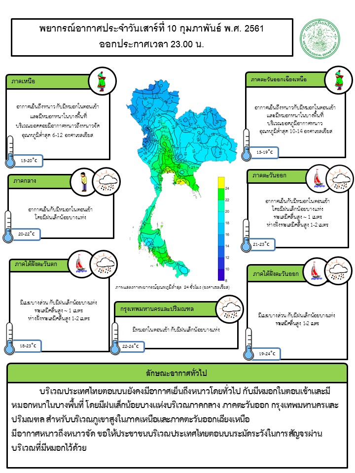 - บริเวณประเทศไทยตอนบนยังคงมีอากาศเย็นถึงหนาวโดยทั่วไป กับมีหมอกในตอนเช้าและมีหมอกหนาในบางพื้นที่ โดยมีฝนเล็กน้อยบางแห่งบริเวณภาคกลาง ภาคตะวันออก กรุงเทพมหานครและปริมณฑล สำหรับบริเวณภูเขาสูงในภาคเหนือและภาคตะวันออกเฉียงเหนือ มีอากาศหนาวถึงหนาวจัด ขอให้ประชาชนบริเวณประเทศไทยตอนบนระมัดระวังในการสัญจรผ่านบริเวณที่มีหมอกไว้ด้วย อนึ่ง ในช่วงวันที่ 12-14 ก.พ. 2561 บริเวณประเทศไทยตอนบนจะมีอากาศหนาวเย็นลงกับมีลมแรง และอุณหภูมิจะลดลง 2-4 องศาเซลเซียส ทั้งนี้เนื่องจากบริเวณความกดอากาศสูงกำลังแรงจากประเทศจีนอีกระลอกจะแผ่ลงมาปกคลุมประเทศไทยตอนบนและทะเลจีนใต้ ประกอบกับมรสุมตะวันออกเฉียงเหนือที่พัดปกคลุมบริเวณอ่าวไทยและภาคใต้จะมีกำลังแรงขึ้น ทำให้ภาคใต้มีฝนเพิ่มขึ้น ส่วนคลื่นลมบริเวณทะเลอันดามันและอ่าวไทยจะมีกำลังแรงขึ้น