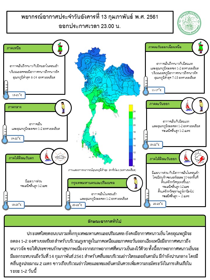 - วันที่ 13-14 ก.พ. 61 ประเทศไทยตอนบนมีอากาศหนาวเย็นลงกับมีลมแรง อุณหภูมิจะลดลง 1-3 องศาเซลเซียส คลื่นลมบริเวณอ่าวไทยและทะเลอันดามันมีคลื่นสูงประมาณ 2 เมตร ส่วนในช่วงวันที่ 15-19 ก.พ. บริเวณประเทศไทยตอนบนยังคงมีอากาศเย็นถึงหนาวโดยทั่วไป อุณหภูมิจะสูงขึ้น 3-5 องศาเซลเซียส กับมีหมอกในตอนเช้าและมีหมอกหนาในบางพื้นที่ ส่วนคลื่นลมบริเวณอ่าวไทยและทะเลอันดามันมีกำลังอ่อนลง