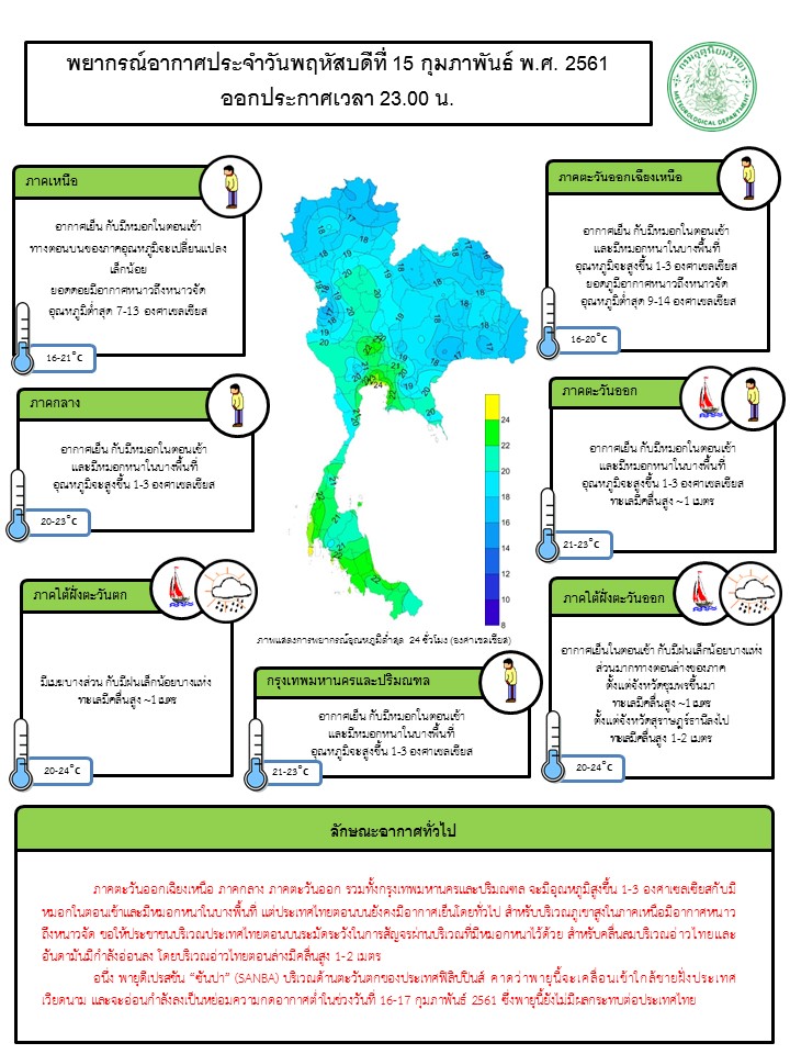 - พยากรณ์อากาศ 24 ชั่วโมงข้างหน้า ภาคตะวันออกเฉียงเหนือ ภาคกลาง ภาคตะวันออก รวมทั้งกรุงเทพมหานครและปริมณฑล จะมีอุณหภูมิสูงขึ้น 1-3 องศาเซลเซียสกับมีหมอกในตอนเช้าและมีหมอกหนาในบางพื้นที่ แต่ประเทศไทยตอนบนยังคงมีอากาศเย็นโดยทั่วไป สำหรับบริเวณภูเขาสูงในภาคเหนือมีอากาศหนาวถึงหนาวจัด ขอให้ประชาชนบริเวณประเทศไทยตอนบนระมัดระวังในการสัญจรผ่านบริเวณที่มีหมอกหนาไว้ด้วย สำหรับคลื่นลมบริเวณอ่าวไทยและอันดามันมีกำลังอ่อนลง โดยบริเวณอ่าวไทยตอนล่างมีคลื่นสูง 1-2 เมตร อนึ่ง พายุดีเปรสชัน “ซันปา” (SANBA) บริเวณด้านตะวันตกของประเทศฟิลิปปินส์ คาดว่าพายุนี้จะเคลื่อนเข้าใกล้ชายฝั่งประเทศเวียดนาม และจะอ่อนกำลังลงเป็นหย่อมความกดอากาศต่ำในช่วงวันที่ 16-17 กุมภาพันธ์ 2561 ซึ่งพายุนี้ยังไม่มีผลกระทบต่อประเทศไทย