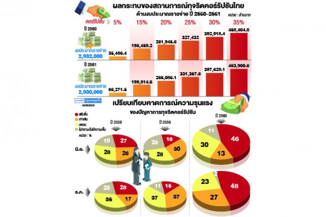 - ศูนย์พยากรณ์เศรษฐกิจและธุรกิจ มหาวิทยาลัยหอการค้าไทย สำรวจดัชนีสถานการณ์คอร์รัปชันไทยเดือน ธ.ค. 60 เทียบกับเดือน มิ.ย. 60 จาก 2,400 ตัวอย่าง ทั้งประชาชน ภาคเอกชนและภาครัฐ พบว่า คะแนนดัชนีสถานการณ์คอร์รัปชันไทยลดลง จาก 53 คะแนน มาอยู่ที่ 52 คะแนน และดัชนีแนวโน้มสถานการณ์คอร์รัปชันไทยในอนาคตก็แย่ลงด้วย เนื่องจากโครงการลงทุนขนาดใหญ่ของรัฐบาลที่จะมีการจัดซื้อจัดจ้าง ทำให้เอกชนพยายามหาช่องทางจ่ายใต้โต๊ะเพื่อให้ได้งาน โดยผลสำรวจพบว่า ในเดือน ธ.ค. 60 มีการจ่ายเงินใต้โต๊ะของเอกชนแก่หน่วยงานรัฐและนักการเมืองเพิ่มขึ้น โดยเฉลี่ยจ่ายที่ร้อยละ 5-15 ของมูลค่าโครงการ จากเดิมร้อยละ 1-15 ซึ่งอาจสร้างความเสียหายได้ถึง 1-2 แสนล้านบาท ทั้งนี้ องค์กรเพื่อความโปร่งใสนานาชาติ จะมีการประเมินคะแนนการแก้ปัญหาคอร์รัปชันของโลกประจำปี 60 ในวันที่ 21 ก.พ. 61 และจากการประเมินในปี 59 พบว่าไทยได้คะแนนลดลง จากคะแนนที่ 38 มาอยู่ที่ 35 ส่งผลให้ตกจากอันดับที่ 76 มาอยู่ที่ 101 จากทั้งหมด 176 ประเทศ