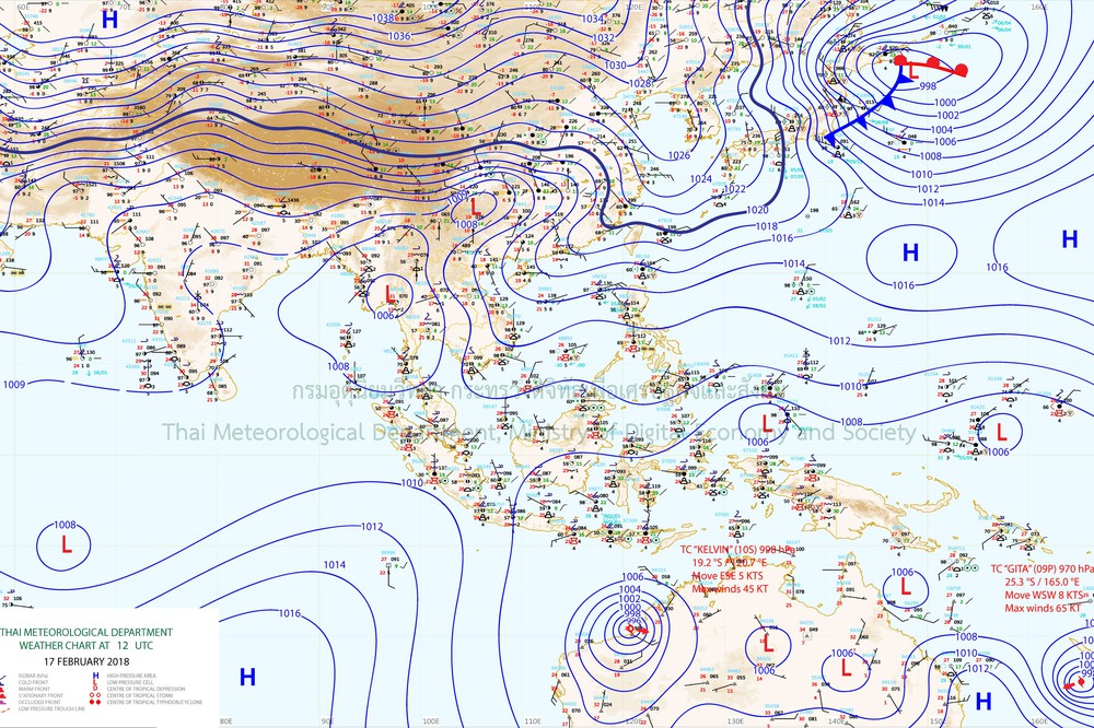 - บริเวณประเทศไทยตอนบนมีอากาศร้อนในตอนกลางวัน อุณหภูมิสูงขึ้น 2-4 องศาเซลเซียส กับมีหมอกในตอนเช้าและมีหมอกหนาในบางพื้นที่ แต่บริเวณภาคเหนือและภาคตะวันออกเฉียงเหนือยังคงมีอากาศเย็นในตอนเช้า ส่วนในช่วงวันที่ 19-23 ก.พ. บริเวณประเทศไทยจะมีแนวโน้มเกิดฝนฟ้าคะนองขึ้น และมีฝนตกหนักบางแห่งบริเวณภาคตะวันออกและภาคใต้ ส่วนคลื่นลมบริเวณอ่าวไทยและทะเลอันดามันมีคลื่นสูงประมาณ 2 เมตร สำหรับกรุงเทพมหานครและปริมณฑลจะมีโอกาสสูงในการเกิดฝนฟ้าคะนอง ส่วนในวันที่ 22-23 ก.พ. บริเวณความกดอากาศสูงระลอกใหม่จากประเทศจีนจะแผ่ลงมาปกคลุมประเทศไทยตอนบนและทะเลจีนใต้ ลักษณะเช่นนี้ทำให้บริเวณดังกล่าวจะมีฝนฟ้าคะนองเกิดขึ้นในระยะแรกหลังจากนั้นจะมีอุณหภูมิลดลง 2-4 องศาเซลเซียสกับมีลมแรงโดยจะเริ่มจากภาคตะวันออกเฉียงเหนือก่อน ส่วนภาคอื่นๆจะได้รับผลกระทบในระยะต่อไป