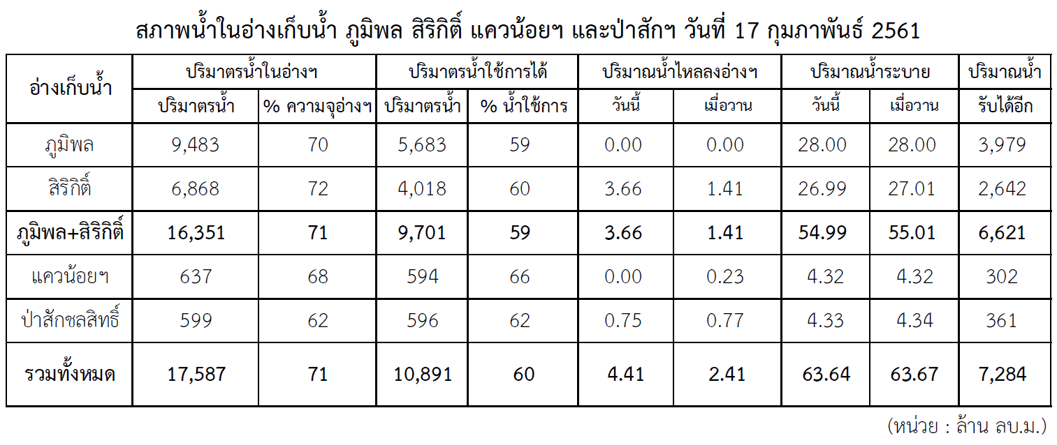 - สถานการณ์น้ำอยู่ในสภาพปกติ โดยอ่างเก็บน้ำภูมิพล สิริกิติ์ แควน้อยฯ และป่าสักชลสิทธิ์ ซึ่งเป็นอ่างเก็บน้ำหลักในพื้นที่ลุ่มแม่น้ำเจ้าพระยา มีปริมาตรน้ำใช้การได้เฉลี่ยร้อยละ 60 หรือ 10,891 ล้าน ลบ.ม. ขณะที่มีปริมาณน้ำระบายอยู่ที่ประมาณ 63 ล้าน ลบ.ม. ต่อวัน คาดว่าเพียงพอต่อการใช้งานตลอดฤดูแล้งที่กำลังจะถึงนี้