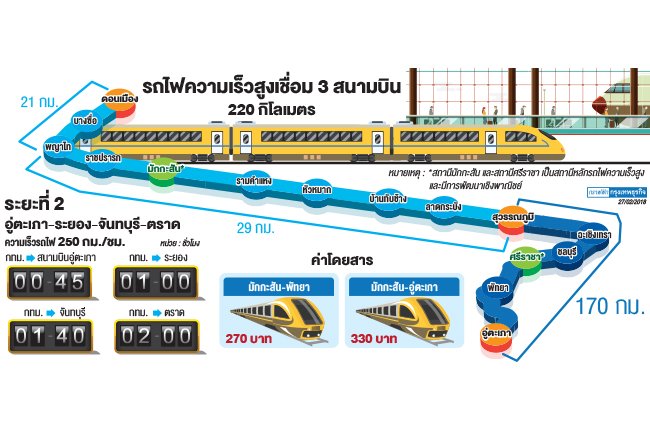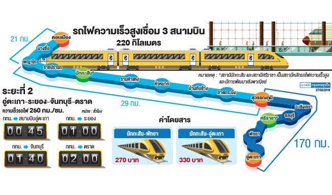 - พลเอก ประยุทธ์ จันทร์โอชา นายกรัฐมนตรี เป็นประธานการประชุมคณะกรรมการนโยบายการพัฒนาระเบียงเศรษฐกิจพิเศษภาคตะวันออก (กนศ.) ครั้งที่ 2/2561 เห็นชอบในหลักการให้สำนักงานเพื่อการพัฒนาระเบียงเศรษฐกิจพิเศษภาคตะวันออก (สกรศ.) ศึกษารายละเอียดการขยายพื้นที่ระเบียงเศรษฐกิจพิเศษในพื้นที่เชื่อมโยงกับ 3 จังหวัดเดิม ภายใน 4 เดือน ก่อนนำเสนอเข้าที่ประชุมพิจารณาอีกครั้ง รวมถึงเห็นชอบในหลักการของโครงการรถไฟความเร็วสูงเชื่อม 3 สนามบิน ดอนเมือง สุวรรณภูมิ อู่ตะเภา และให้นำเสนอ ครม. เพื่อพิจารณา โดยโครงการรถไฟความเร็วสูงเชื่อม 3 สนามบิน เป็น 1 ใน 5 โครงการเร่งด่วนด้านโครงสร้างพื้นฐานที่มีผลต่อความสำเร็จของการพัฒนาระเบียงเศรษฐกิจภาคตะวันออก ที่พัฒนามาจากโครงการรถไฟความเร็วสูงสายตะวันออก (ลาดกระบัง-ระยอง) ที่เป็นโครงการเดิม โดยได้ปรับปรุงหลักการให้เข้าเชื่อม 3 สนามบินอย่างไร้รอยต่อ อันจะเกิดประโยชน์สูงสุดกับประเทศและประชาชนในอนาคต