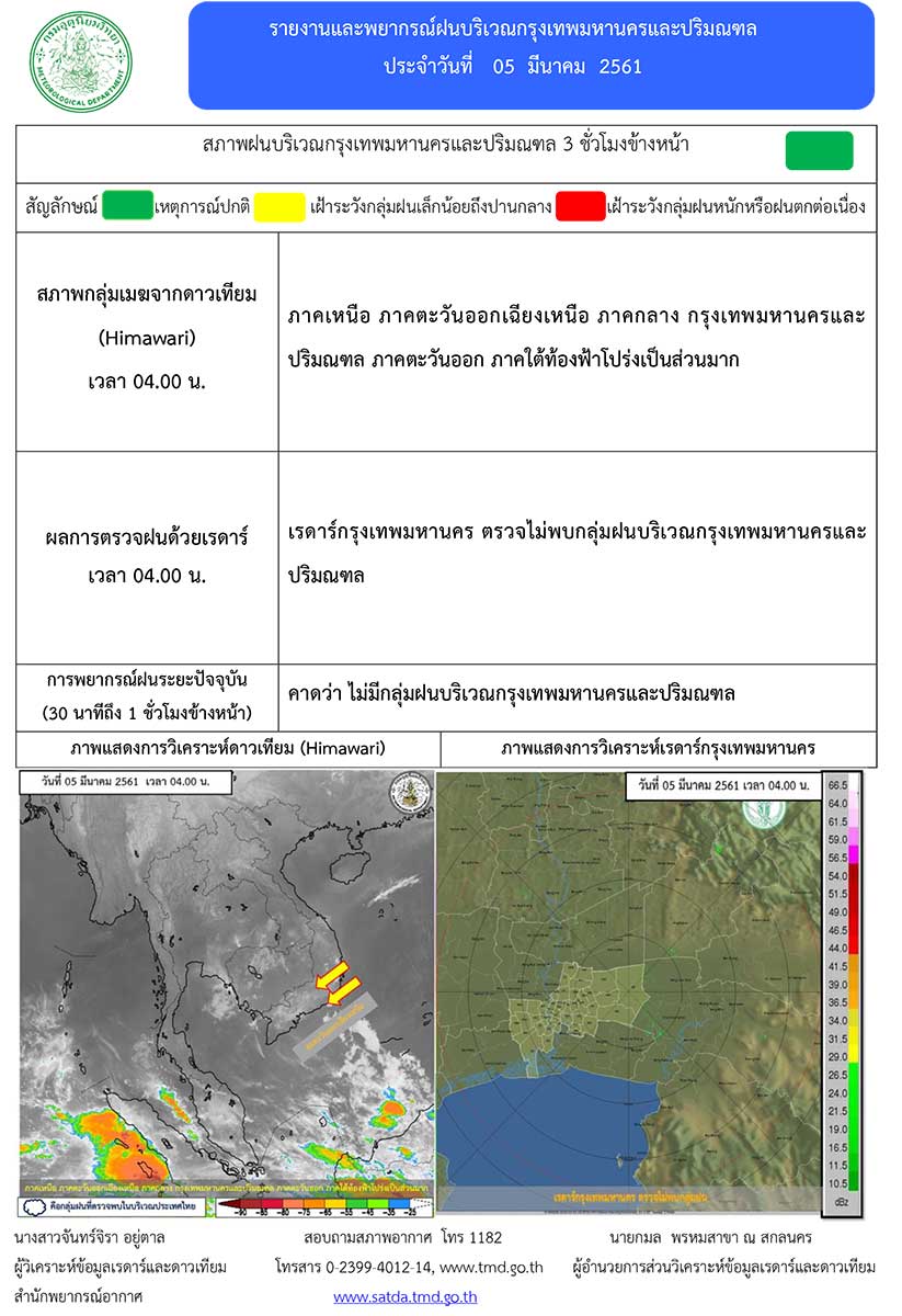 - บริเวณประเทศไทยมีอากาศร้อนในตอนกลางวัน โดยมีฝนฟ้าคะนองบางแห่งบริเวณภาคตะวันออกเฉียงเหนือตอนล่าง ภาคตะวันออก รวมทั้งกรุงเทพและปริมณฑล ส่วนในช่วงวันที่ 7 – 10 มีนาคม 2561 บริเวณประเทศไทยตอนบนจะมีพายุฤดูร้อนเกิดขึ้นได้บางพื้นที่ โดยมีลักษณะพายุฝนฟ้าคะนอง ลมกระโชกแรง และลูกเห็บตกได้บางพื้นที่ สำหรับภาคใต้จะมีฝนเพิ่มขึ้นข้อควรระวัง ในช่วงวันที่ 7 – 9 มีนาคม 2561 ขอให้ประชาชนบริเวณประเทศไทยตอนบนหลีกเลี่ยงการอยู่ในที่โล่งแจ้ง ใต้ต้นไม้ใหญ่ และป้ายโฆษณาที่ไม่แข็งแรง ในขณะเกิดพายุฝนฟ้าคะนองและลมกระโชกแรง สำหรับเกษตรกรควรระวังความเสียหายที่จะเกิดต่อผลผลิตทางการเกษตรไว้ด้วย