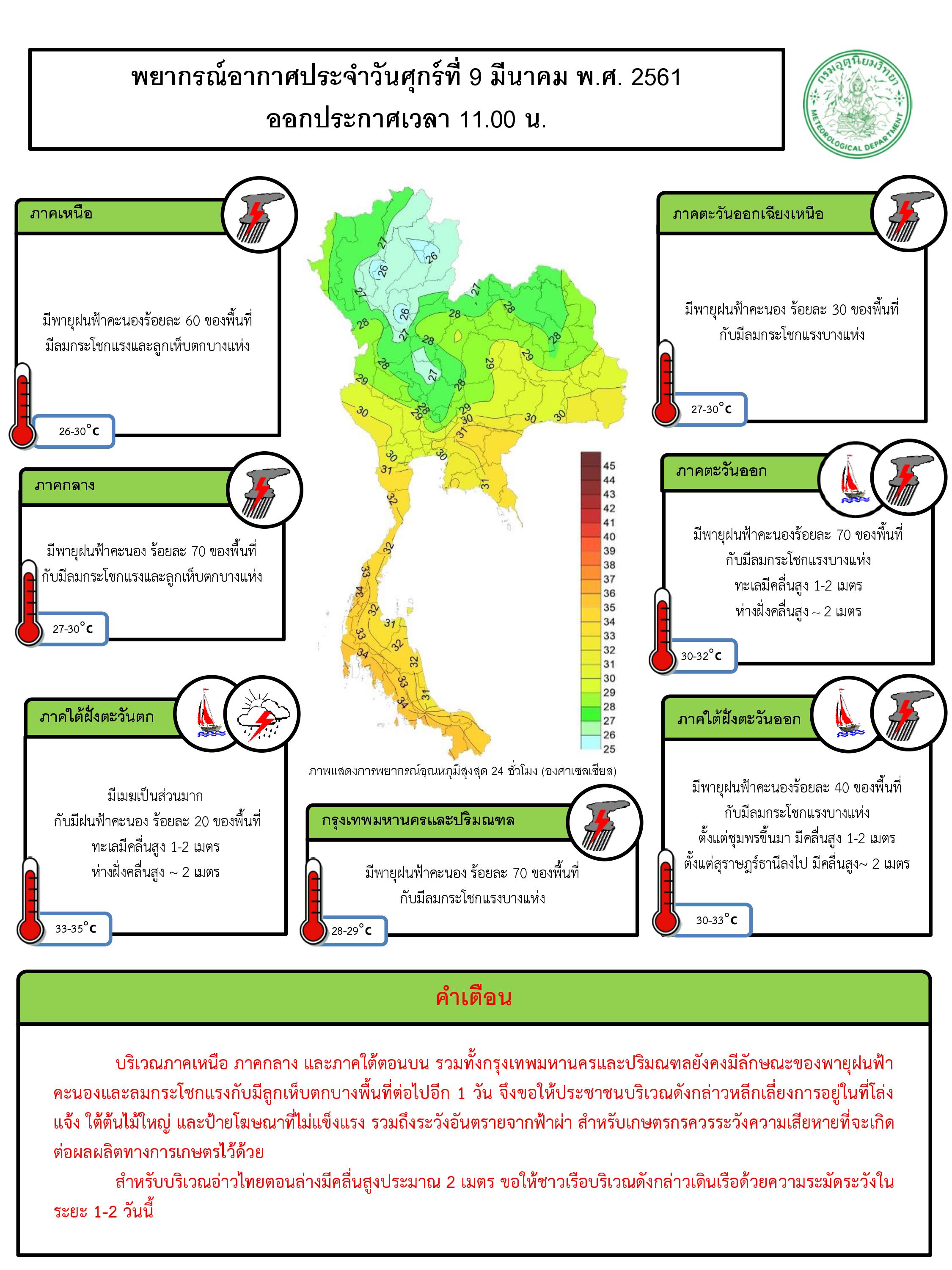 - บริเวณภาคเหนือ ภาคกลาง และภาคใต้ตอนบน รวมทั้งกรุงเทพมหานครและปริมณฑลยังคงมีลักษณะของพายุฝนฟ้าคะนองและลมกระโชกแรงกับมีลูกเห็บตกบางพื้นที่ต่อไปอีก 1 วัน หลังจากนั้นในวันที่ 10 มี.ค. 61 เป็นต้นไป บริเวณประเทศไทยตอนบนจะมีพายุฝนฟ้าคะนองลดลง สำหรับภาคใต้ตอนล่างมีฝนเพิ่มขึ้น