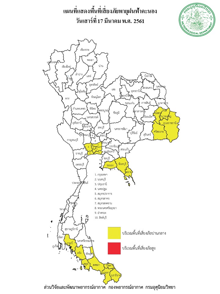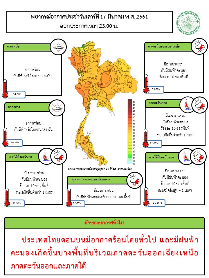 - ประเทศไทยตอนบนมีอากาศร้อนโดยทั่วไป และมีฝนฟ้าคะนองเกิดขึ้นบางพื้นที่บริเวณภาคตะวันออกเฉียงเหนือ ภาคตะวันออก และภาคใต้ อนึ่ง ในช่วงวันที่ 20-23 มี.ค. 61 บริเวณความกดอากาศสูงจากประเทศจีนจะแผ่ลงมาปกคลุมประเทศไทยตอนบนและทะเลจีนใต้ ในขณะที่ประเทศไทยมีอากาศร้อน ทำให้บริเวณดังกล่าวมีพายุฤดูร้อนเกิดขึ้น โดยมีลักษณะของพายุฝนฟ้าคะนอง ลมกระโชกแรง กับมีลูกเห็บตกบางพื้นที่ รวมถึงฟ้าผ่า โดยภาคตะวันออกเฉียงเหนือและภาคตะวันออกจะได้รับผลกระทบในวันที่ 20 มี.ค. 61 ส่วนภาคเหนือ ภาคกลาง รวมทั้ง กทม. และปริมณฑล จะได้รับผลกระทบในวันถัดไป จึงขอให้ประชาชนในบริเวณดังกล่าวระวังอันตรายจากพายุฤดูร้อนที่จะเกิดขึ้น โดยหลีกเลี่ยงการอยู่ในที่โล่งแจ้ง ใต้ต้นไม้ใหญ่ และป้ายโฆษณาที่ไม่แข็งแรง รวมถึงอันตรายจากฟ้าผ่า สำหรับเกษตรกรควรเตรียมการป้องกันและระวังความเสียหายที่จะเกิดต่อผลผลิตทางการเกษตรไว้ด้วย
