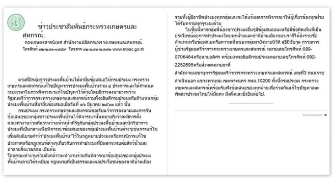 - กษ. ออกแถลงการณ์ว่า จากกรณีที่มีกลุ่มชาวประมงพื้นบ้านได้มายื่นข้อเสนอให้แก้ไขปัญหาการประมงพื้นบ้านนั้น กรมประมงว่าจะตั้งคณะทำงานร่วมกันระหว่างเจ้าหน้าที่รัฐกับกลุ่มประมงพื้นบ้านและนักวิชาการประมงที่เป็นกลางเพื่อพิจารณาข้อเสนอของกลุ่มประมงพื้นบ้านต่าง ๆ เช่นการแก้ไขเพิ่มเติมนิยามคำว่า “ประมงพื้นบ้าน” ไว้ในกฎหมายประมงหรือกรณีการแก้ไขประกาศหรือกฎเกณฑ์ต่าง ๆ เกี่ยวกับการทำประมงที่มีผลกระทบต่อสัตว์น้ำและทำลายสิ่งแวดล้อม