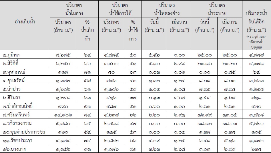 - สภาพน้ำในอ่างเก็บน้ำขนาดใหญ่ปริมาตรน้ำในอ่างฯ 49,545 ล้าน ลบ.ม. คิดเป็นร้อยละ 70 (ปริมาตรน้ำใช้การได้ 26,001 ล้าน ลบ.ม. คิดเป็นร้อยละ 55) ปริมาตรน้ำในอ่างฯ เทียบกับปี 60 (42,705 ล้าน ลบ.ม. คิดเป็นร้อยละ 60) มากกว่าปี 60 6,840 ล้าน ลบ.ม. ปริมาณน้ำไหลลงอ่างฯ 31.74 ลบ.ม. ปริมาณน้ำระบาย 132.13 ล้าน ลบ.ม. สามารถรับน้ำได้อีก 21,322 ล้าน ลบ.ม.