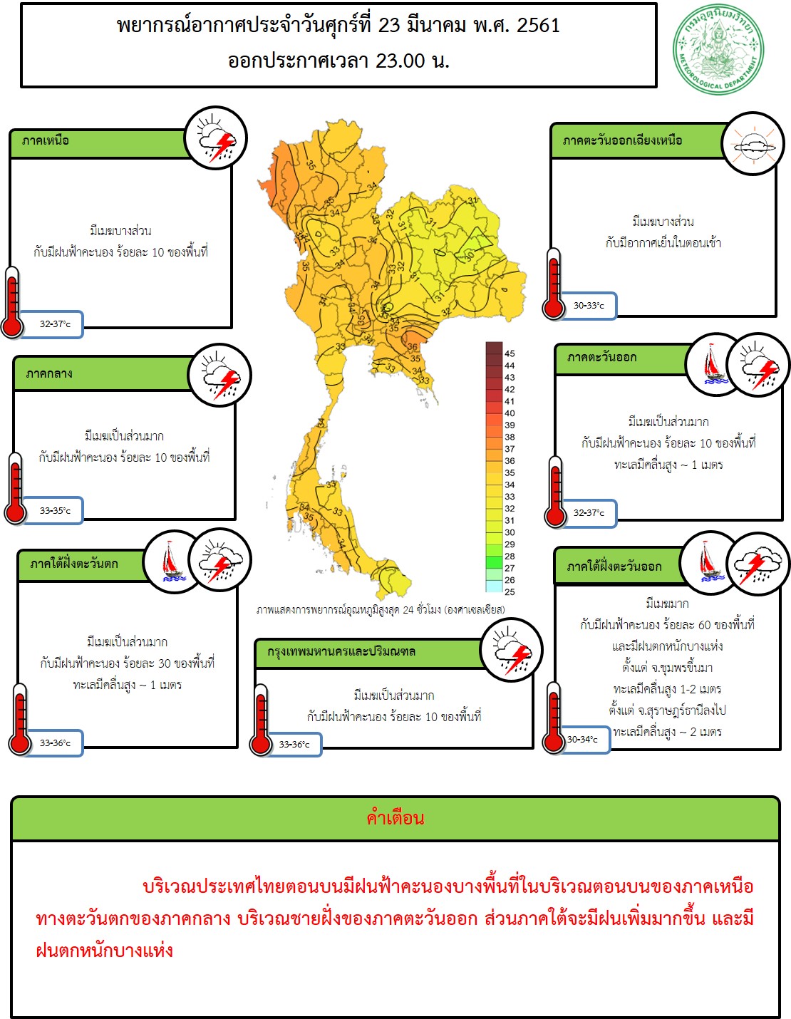 - บริเวณประเทศไทยตอนบนมีฝนฟ้าคะนองบางพื้นที่ในบริเวณด้านตะวันตกของภาคเหนือและภาคกลาง บริเวณชายฝั่งของภาคตะวันออก ส่วนภาคใต้จะมีฝนฟ้าคะนองและมีฝนตกหนักบางแห่ง