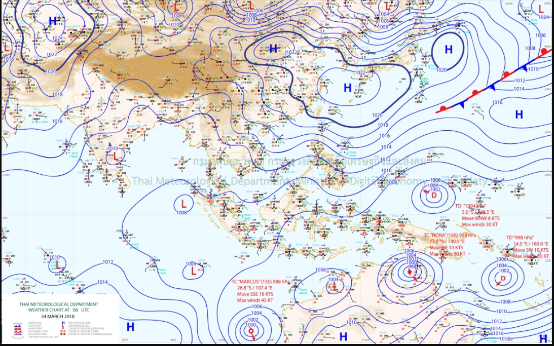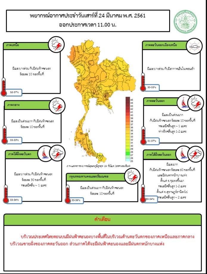 - ประเทศไทยตอนบนมีฝนฟ้าคะนองบางพื้นที่ในบริเวณด้านตะวันตกของภาคเหนือและภาคกลาง บริเวณชายฝั่งของภาคตะวันออก ส่วนภาคใต้มีฝนฟ้าคะนองหลายพื้นที่และมีฝนตกหนักบางแห่ง