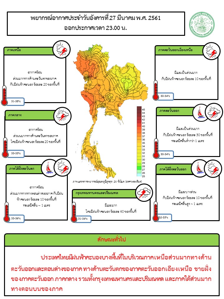- ประเทศไทยมีฝนฟ้าคะนองบางพื้นที่ในบริเวณทางด้านตะวันออกและตอนล่างของภาคเหนือ ทางด้านตะวันตกของภาคตะวันออกเฉียงเหนือ ชายฝั่งของภาคตะวันออก ภาคกลาง รวมทั้งกรุงเทพมหานครและปริมณฑล และภาคใต้ส่วนมากทางตอนบนของภาค ลมใต้และลมตะวันออกเฉียงใต้พัดนำความชื้นจากทะเลจีนใต้และอ่าวไทยเข้ามาปกคลุมประเทศไทยตอนบน ทำให้บริเวณดังกล่าวมีฝนฟ้าคะนองเกิดขึ้นในระยะนี้ ส่วนลมตะวันออกที่พัดปกคลุมอ่าวไทยและภาคใต้มีกำลังอ่อน ทำให้ภาคใต้มีฝนฟ้าคะนองได้บางพื้นที่