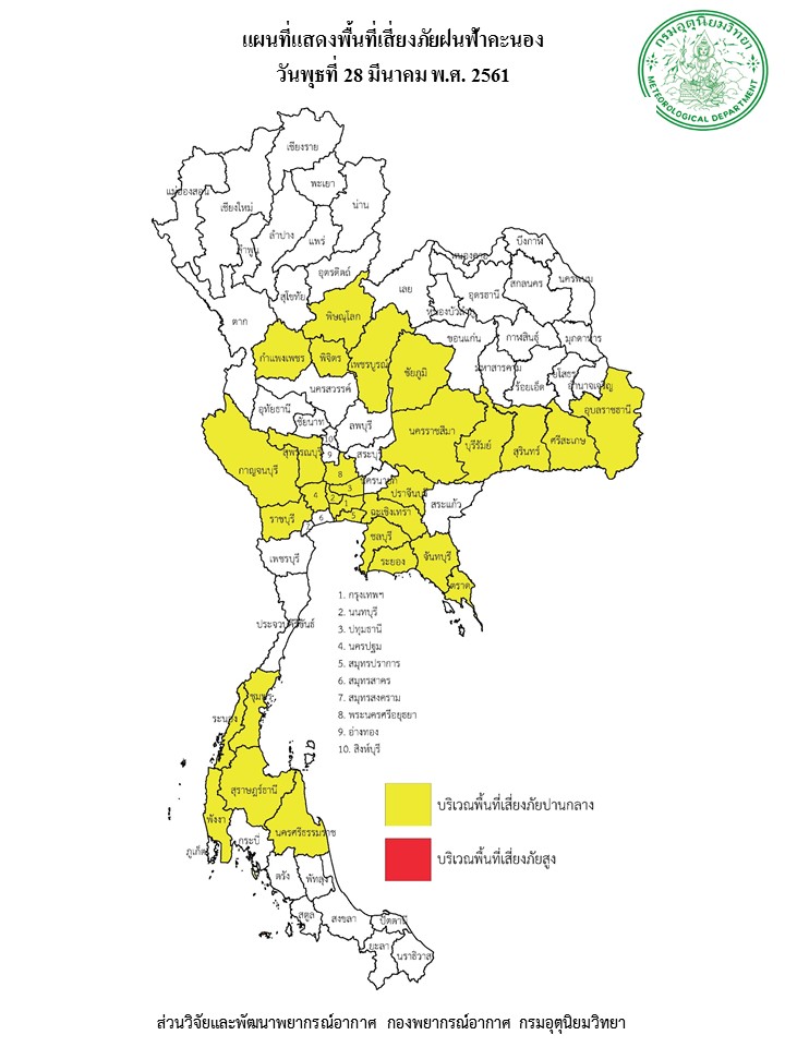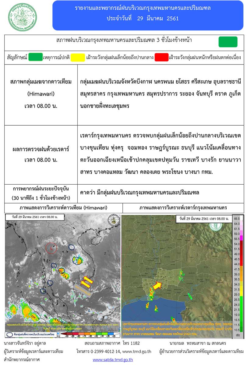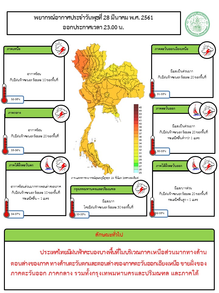 - ภาคเหนือและภาคกลางมีอุณหภูมิสูงขึ้นทำให้มีอากาศร้อนกับมีฝนฟ้าคะนองบางพื้นที่ โดยเฉพาะบริเวณภาคเหนือส่วนมากทางด้านตอนล่างของภาค ส่วนด้านตะวันตกและตอนล่างของภาคตะวันออกเฉียงเหนือ ภาคตะวันออก ภาคกลาง รวมทั้งกรุงเทพมหานครและปริมณฑล และภาคใต้ มีอากาศร้อนกับมีฝนฟ้าคะนองบางพื้นที่