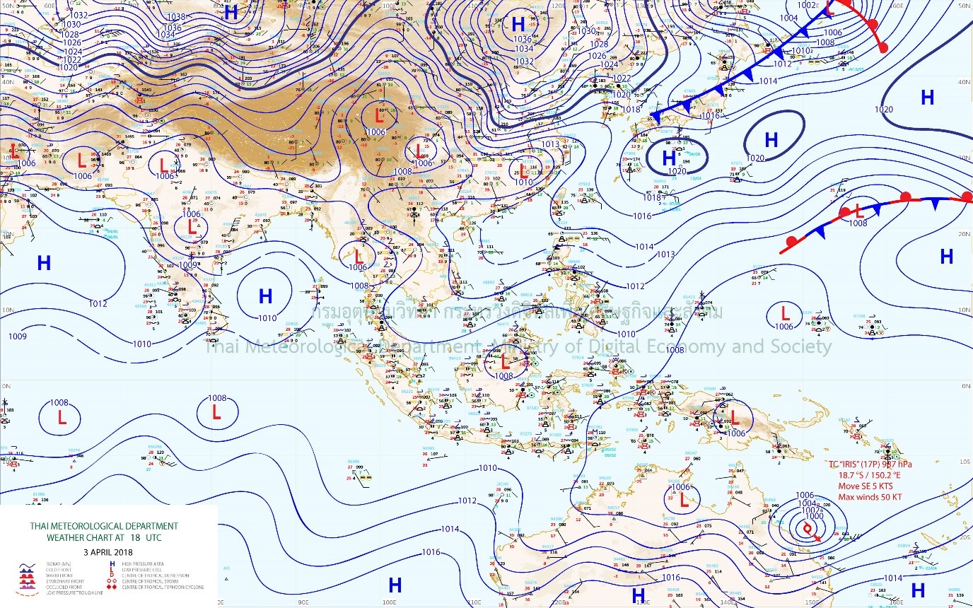 - บริเวณประเทศไทยตอนบน รวมทั้งกรุงเทพมหานครและปริมณฑลจะมีฝนฟ้าคะนองเพิ่มขึ้น ขอให้ประชาชนบริเวณดังกล่าวระมัดระวังอันตรายจากฝนฟ้าคะนองและลมกระโชกแรงไว้ด้วย ส่วนภาคใต้มีฝนฟ้าคะนองลดลง อนึ่ง บริเวณความกดอากาศสูงจากประเทศจีนได้แผ่ปกคลุมประเทศจีนตอนกลางแล้ว คาดว่าในช่วงวันที่ 5-7 เม.ย. 61จะแผ่ลงมาปกคลุมประเทศไทยตอนบนและทะเลจีนใต้ ทำให้บริเวณประเทศไทยตอนบนมีพายุฤดูร้อนเกิดขึ้น โดยมีลักษณะพายุฝนฟ้าคะนอง ลมกระโชกแรง กับมีลูกเห็บตก และมีฝนตกหนักบางพื้นที่ จึงขอให้ประชาชนระวังอันตรายจากพายุฝนฟ้าคะนอง ลมกระโชกแรง และฟ้าผ่า ที่จะเกิดขึ้นโดยหลีกเลี่ยงการอยู่ในที่โล่งแจ้ง ใต้ต้นไม้ใหญ่ และป้ายโฆษณาที่ไม่แข็งแรง รวมถึงระวังอันตรายจากฝนตกหนักและฝนตกสะสมที่อาจทำให้เกิดน้ำท่วมขัง และน้ำป่าไหลหลาก สำหรับเกษตรกรควรเตรียมการป้องกันและระวังความเสียหายที่จะเกิดต่อผลผลิตทางการเกษตรไว้ด้วย
