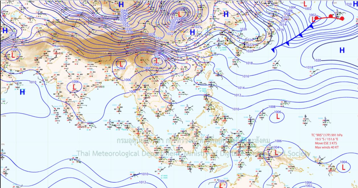 - ภาคเหนือ มีเมฆเป็นส่วนมาก ประกอบกับมีฝนฟ้าคะนองร้อยละ 60 ของพื้นที่ และมีลมกระโชกแรงบางแห่ง ส่วนมากบริเวณจังหวัดเชียงราย ลำปาง พะเยา แพร่ น่าน อุตรดิตถ์ เพชรบูรณ์ พิษณุโลก สุโขทัย พิจิตร กำแพงเพชร และตาก ภาคตะวันออกเฉียงเหนือ มีเมฆเป็นส่วนมาก ประกอบกับมีฝนฟ้าคะนอง ร้อยละ 20 ของพื้นที่ ส่วนมากบริเวณจังหวัดเลย หนองบัวลำภู อุดรธานี ขอนแก่น ชัยภูมิ และนครราชสีมา ภาคใต้ มีเมฆเป็นส่วนมาก ประกอบกับมีฝนฟ้าคะนองร้อยละ 20 ของพื้นที่ ส่วนมากบริเวณจังหวัดระนอง พังงา ภูเก็ต กระบี่ ตรัง และสตูล กรุงเทพมหานครและปริมณฑล มีเมฆเป็นส่วนมาก และมีฝนฟ้าคะนองร้อยละ 40 ของพื้นที่ ทั้งนี้ ความกดอากาศสูงกำลังค่อนข้างแรงจากประเทศจีนยังคงปกคลุมประเทศจีนตอนกลาง คาดว่าในช่วงวันที่ 5-7 เมษายน 2561 จะแผ่ลงมาปกคลุมประเทศไทยตอนบนและทะเลจีนใต้ ทำให้บริเวณประเทศไทยตอนบนมีพายุฤดูร้อนเกิดขึ้น