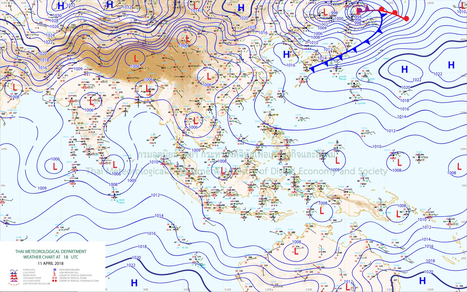 - ประเทศไทยตอนบนมีอุณหภูมิสูงขึ้นและมีอากาศร้อนโดยทั่วไป โดยบริเวณภาคเหนือ ภาคกลาง และภาคตะวันออกอาจมีฝนฟ้าคะนองบางพื้นที่ อนึ่ง ในช่วงวันที่ 15 – 18 เมษายน 2561 ประเทศไทยตอนบนจะมีพายุฤดูร้อนเกิดขึ้น โดยจะเริ่มมีผลกระทบบริเวณภาคตะวันออกเฉียงเหนือและภาคตะวันออก ในวันที่ 15 เมษายน 2561 ส่วนภาคเหนือ ภาคกลาง รวมทั้งกรุงเทพมหานครและปริมณฑล จะได้รับผลกระทบในวันถัดไป (วันที่ 16 เมษายน 2561) จึงขอให้ประชาชนในบริเวณดังกล่าวระวังอันตรายจากพายุฤดูร้อนที่จะเกิดขึ้น สำหรับเกษตรกรควรเตรียมการป้องกันและระวังความเสียหายที่จะเกิดต่อผลผลิตทางการเกษตร