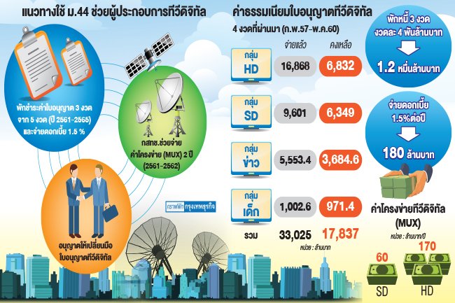 - โฆษกประจำสำนักนายกรัฐมนตรี (พล.ท. สรรเสริญฯ) เปิดเผยว่าที่ประชุมคณะรักษาความสงบแห่งชาติเห็นชอบในหลักการออกคำสั่งตาม ม.44 เพื่อเยียวยาผู้ประกอบการทีวีดิจิทัลที่มีปัญหาการทำธุรกิจ 3 มาตรการดังนี้ 1.พักชำระใบอนุญาต 3 งวดจาก 5 งวดที่ยังค้างชำระอยู่จากใบอนุญาตทั้งหมด 6 งวด โดย 3 งวดที่ให้พักค่าใบอนุญาตผู้ประกอบการแต่ละรายเลือก 3 ใน 5 งวดที่ต้องชำระในปี 2561-2562 ต้องชำระในเดือน พ.ค.ทุกปี และจ่ายดอกเบี้ย 1.5% ในระหว่างการพักชำระหนี้ 2. กรณีการเช่าโครงข่ายจากระบบอนาล็อคเป็นดิจิทัลนั้น กสทช. จะให้การช่วยเหลือโดยการจ่ายเงินให้ครึ่งหนึ่งเป็นระยะเวลา 2 ปี 3.อนุญาตให้สามารโอนใบอนุญาตต่อได้