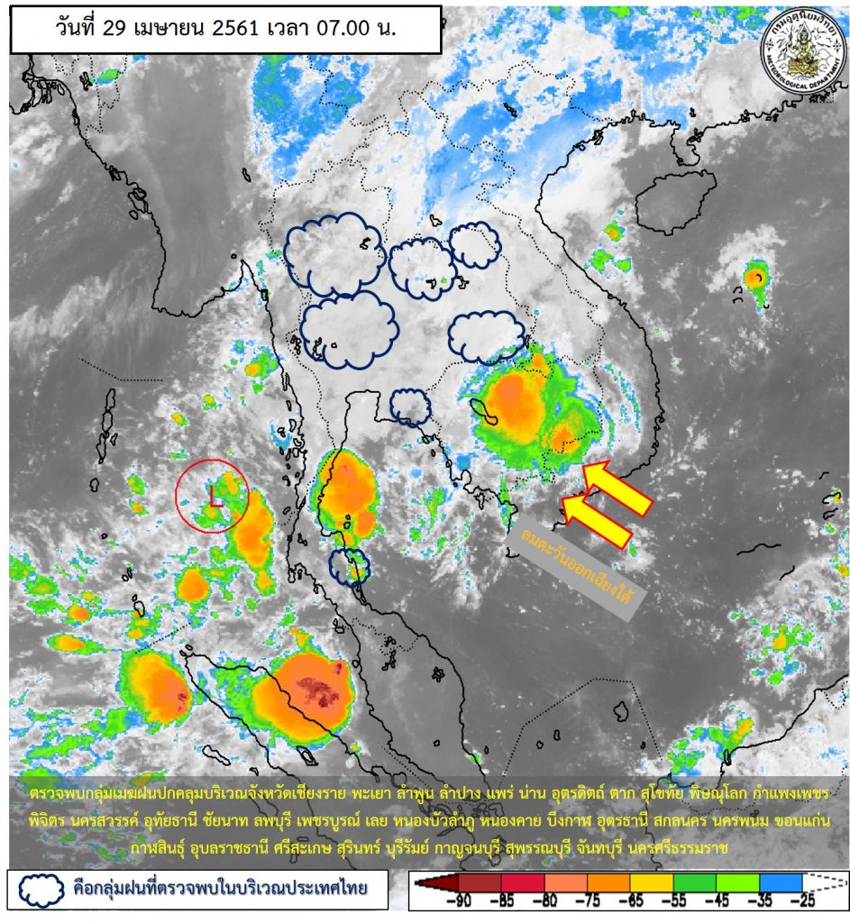 - สถานการณ์อากาศ: ในช่วง 7 วันที่ผ่านมามีหย่อมความกดอากาศต่ำเนื่องจากความร้อนปกคลุมประเทศไทยตอนบน กับมีลมตะวันออกเฉียงใต้พัดปกคลุมประเทศไทยในระยะต้นและกลางช่วง โดยบริเวณความกดอากาศสูงจากประเทศจีนได้แผ่ลงมาปกคลุมบริเวณประเทศไทยตอนบน กับมีคลื่นกระแสลมตะวันตกจากประเทศเมียนมาร์เคลื่อนเข้าปกคลุมภาคเหนือในระยะปลายช่วง ลักษณะดังกล่าวทำให้ในช่วงนี้บริเวณประเทศไทยตอนบนมีอากาศร้อนเกือบทั่วไปเกือบตลอดช่วง กับมีอากาศร้อนจัดบางพื้นที่ โดยมีรายงานฝนและฝนฟ้าคะนอง ลมกระโชกแรงในหลายพื้นที่และมีลูกเห็บตกบางพื้นที่ในระยะครึ่งหลังของช่วง สำหรับภาคใต้มีหย่อมความกดอากาศต่ำปกคลุมบริเวณช่องแคบมะละกาในระยะปลายช่วง ทำให้มีฝนเพิ่มขึ้นในช่วงดังกล่าว และในอีก 7 วันข้างหน้า บริเวณประเทศไทยมีฝนฟ้าคะนองและลมกระโชกแรง กับมีฝนตกหนักบางพื้นที่บริเวณภาคตะวันออกและภาคใต้ ส่วนในช่วงวันที่ 3 – 4 พ.ค. บริเวณประเทศไทยมีฝนฟ้าคะนองลดลง เว้นภาคเหนือและภาคตะวันออกเฉียงเหนือยังคงมีฝนฟ้าคะนองบางพื้นที่
