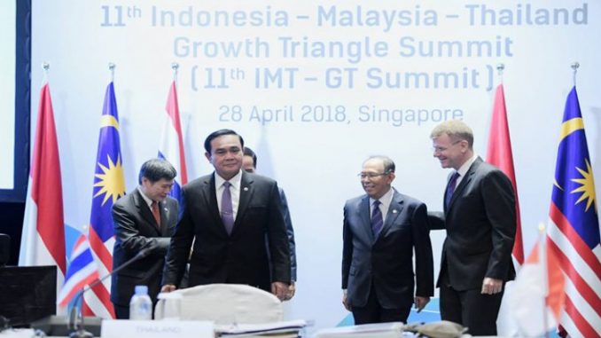 พล.อ.ประยุทธ์ จันทร์โอชา นายกรัฐมนตรี เป็นประธานการประชุมระดับผู้นำแผนงานการพัฒนาเขตเศรษฐกิจสามฝ่าย อินโดนีเซีย-มาเลเซีย-ไทย (IMT-GT) ครั้งที่ 11 และได้กล่าวยินดีที่แผนงานความร่วมมือ IMT-GT ครบรอบการก่อตั้ง 25 ปีในปีนี้ ถือเป็นความร่วมมือที่มีบทบาทสำคัญในการลดความเหลื่อมล้ำ โดยวิสัยทัศน์ในช่วงปี 2550-2559 คือ การเป็นอนุภูมิภาคแห่งการบูรณาการ มีความก้าวหน้า รุ่งเรือง และมีสันติภาพ ภายใต้กรอบแนวทางความร่วมมือ 6 สาขา และตาม 5 แนวระเบียงเศรษฐกิจ เช่น การพัฒนาโครงสร้างพื้นฐาน การอำนวยความสะดวกด้านการค้าการลงทุนทั้งภายใน IMT-GT และกับอาเซียน การพัฒนาเขตเศรษฐกิจพิเศษ การพัฒนาผู้ประกอบการ การยกระดับคุณภาพสินค้าและบริการฮาลาล การพัฒนาเมืองสีเขียวเพื่อการพัฒนาที่ยั่งยืน และสามารถจะพัฒนาไปสู่เครือข่ายเมืองอัจฉริยะอาเซียนต่อไป