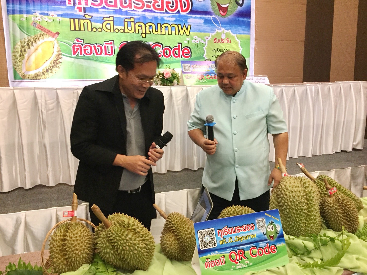นายสุรศักดิ์ เจริญศิริโชติ ผู้ว่าราชการจังหวัดระยอง นายไชยา บุญญานุภาพ สหกรณ์จังหวัดระยอง นายสุรสิงห์ พูนเพิ่มสุขสมบัติ เกษตรจังหวัดระยอง และนางวรัญญา ถนอมพันธ์ พาณิชย์จังหวัดระยอง ร่วมแถลงข่าวการติดคิวอาร์โค้ดทุเรียน ซึ่งเป็นเครื่องมือตรวจสอบย้อนกลับสู่ต้นตอให้ทราบถึงแหล่งกำเนิด สถานที่ผลิต รายละเอียดข้อมูลของผู้ผลิต ขบวนการผลิต การเก็บรักษา มาตรฐานที่ได้รับ ซึ่งเป็นมาตรการในการป้องกันการนำทุเรียนอ่อนออกจำหน่าย และเป็นการสร้างความเชื่อมั่นให้กับผู้บริโภคให้เกิดความพึงพอใจในทุเรียนระยอง พร้อมกันนี้ได้มีการจัดอบรมให้ความรู้กับเกษตรกร ในการใช้โปรแกรม QR Code การใช้เครื่องตรวจวัดคุณภาพทุเรียนการทำข้อมูลรายละเอียดเกษตรกรชาวสวนทุเรียน และแจกสติ๊กเกอร์คิวอาร์โค้ดให้เกษตรกรนำไปติดที่ขั้วทุเรียนเป็นการยืนยันว่าได้ผลิตทุเรียนคุณภาพ “ทุเรียน ระยอง แท้ ดี มีคุณภาพ ต้องมี QR Code”