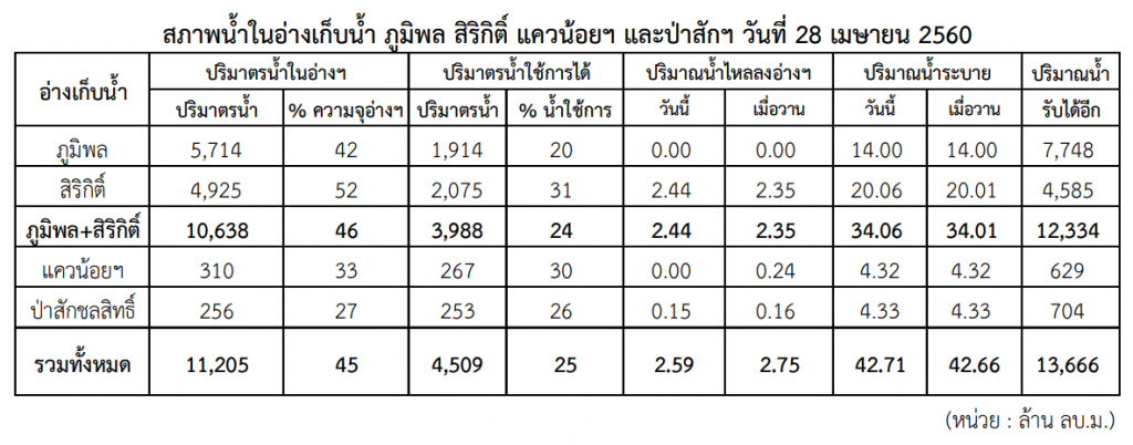 ภายหลังวันที่ 27 เมษายน 2561 พบว่าหลายจังหวัดในภาคเหนือและภาคตะวันออกเฉียงเหนือได้รับผลกระทบจากพายุฤดูร้อน โดยเฉพาะที่จังหวัดอุบลราชธานีและหนองคาย มีพายุฝนและลมกระโชกแรงพัดบ้านเรือนชาวบ้านได้รับความเสียหายกว่า 500 หลัง หน่วยงานในพื้นที่เร่งช่วยเหลือประชาชน และซ่อมแซมสาธารณูปโภคพื้นฐาน เช่น ไฟฟ้าและโทรศัพท์ อย่างเร่งด่วน- สถานการณ์น้ำ: สถานการณ์น้ำในภาพรวมเป็นปกติ ปริมาณน้ำกักเก็บในเขื่อนภูมิพล เขื่อนสิริกิติ์ เขื่อนแควน้อยฯ และเขื่อนป่าสักชลสิทธิ์ ซึ่งเป็น 4 เขื่อนหลักที่สำคัญของลุ่มน้ำเจ้าพระยา ลดลงเพียงร้อยละ 5 คงเหลือร้อยละ 56 เมื่อเทียบกับเดือนที่ผ่านมา ขณะที่ปริมาณน้ำกักเก็บในอ่างเก็บน้ำขนาดใหญ่ทั่วประเทศอยู่ที่ร้อยละ 63 สูงกว่าปี 2560 ถึงร้อยละ 8 ทำให้ปริมาณน้ำดังกล่าวเพียงพอที่จะดำเนินการตามมาตรการการแก้ไขปัญหาผลผลิตทางการเกษตรได้รับความเสียหายจากภาวะน้ำท่วม ซึ่งจะปล่อยน้ำเข้าสู้พื้นที่เพาะปลูกข้าวเร็วขึ้นกว่าปกติ 1 เดือน ในส่วนของสถานการณ์ภัยแล้งทั่วประเทศ กรมชลประทานเตรียมเครื่องสูบน้ำเคลื่อนที่เพื่อช่วยเหลือพื้นที่นาปี นาปรัง อุปโภคบริโภค พืชไร่ และอุทกภัยรวมทั้งสิ้น 1,900 เครื่อง พร้อมทั้งเตรียมให้การสนับสนุนรถยนต์บรรทุกน้ำ 295 คัน สำหรับพื้นที่ที่ขาดแคลนน้ำเพื่อใช้ในการอุปโภคบริโภค