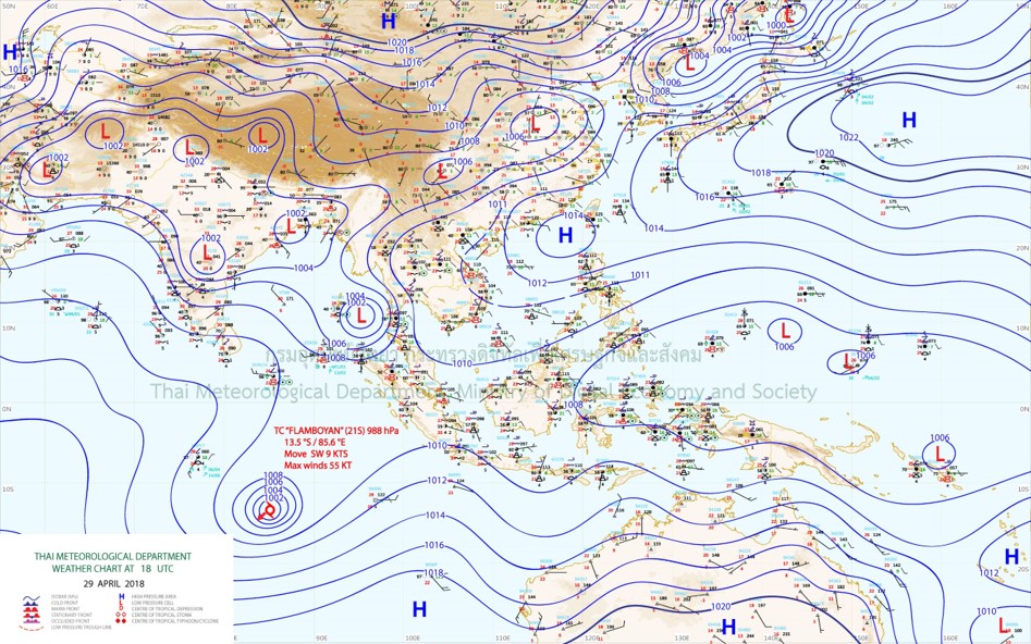 - บริเวณประเทศไทยยังคงมีฝนฟ้าคะนองหลายพื้นที่ กับมีฝนตกหนักบางแห่งบริเวณภาคตะวันออก ภาคกลาง รวมทั้งกรุงเทพมหานครและปริมณฑล และภาคใต้ ขอให้ประชาชนในบริเวณดังกล่าวระวังอันตรายจากฝนตกหนักและฝนที่ตกสะสมไว้ด้วย โดยลักษณะสำคัญทางอุตุนิยมวิทยา จะมีหย่อมความกดอากาศต่ำกำลังแรงปกคลุมทะเลอันดามันตอนบน มีแนวโน้มเคลื่อนเข้าใกล้อ่าวมะตะบัน ประเทศเมียนมา ในวันนี้ (30 เมษายน 2561) ประกอบกับมีลมใต้และลมตะวันออกเฉียงใต้พัดปกคลุมภาคตะวันออกเฉียงเหนือ ภาคกลาง และภาคตะวันออก ลักษณะเช่นนี้ทำให้บริเวณประเทศไทยยังคงมีฝนฟ้าคะนองเกิดขึ้นหลายพื้นที่ กับมีฝนตกหนักบางแห่ง