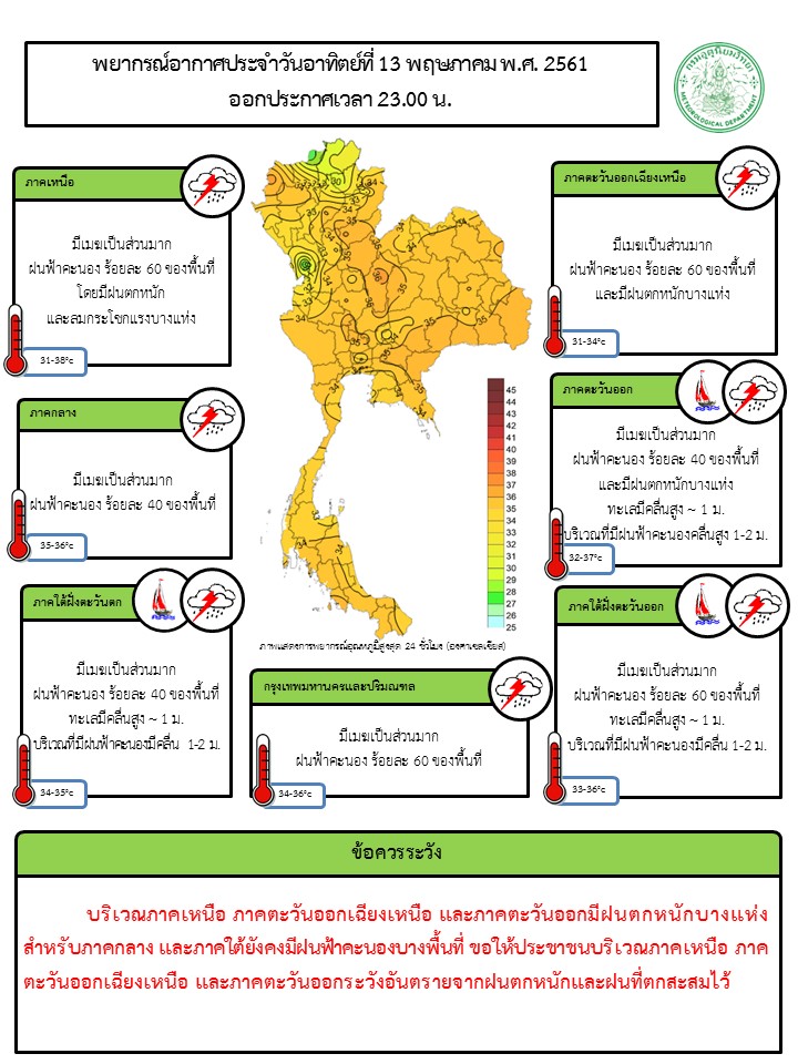 - ประเทศไทยตอนบนยังคงมีฝนฟ้าคะนองหลายพื้นที่ กับมีฝนตกหนักบางแห่งบริเวณภาคเหนือ ภาคตะวันออกเฉียงเหนือ และภาคตะวันออก ขอให้ประชาชนบริเวณภาคเหนือ ภาคตะวันออกเฉียงเหนือ และภาคตะวันออกระวังอันตรายจากฝนตกหนักและฝนที่ตกสะสมไว้ด้วย