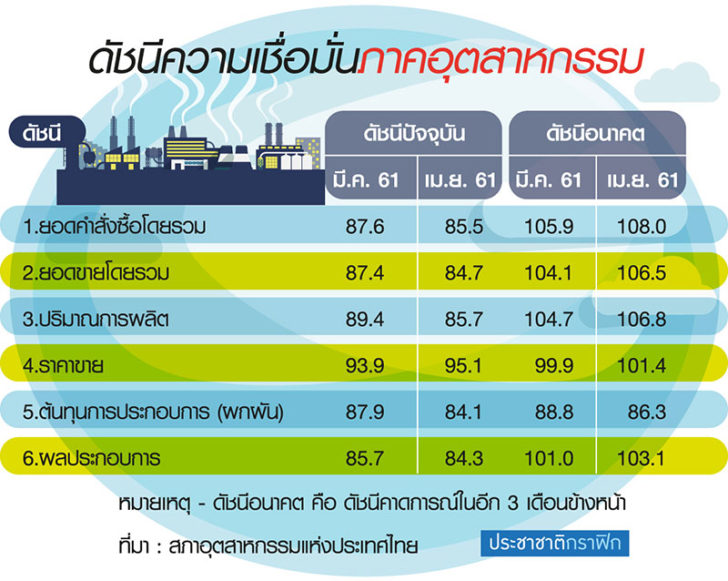 - สภาอุตสาหกรรมแห่งประเทศไทย (ส.อ.ท.) สำรวจความเชื่อมั่นผู้ประกอบการประจำเดือนเมษายน 2561 ครอบคลุม 45 กลุ่มอุตสาหกรรม พบว่า ดัชนีความเชื่อมั่นภาคอุตสาหกรรม เดือนเมษายน 2561 อยู่ที่ระดับ 89.1 ลดลงจากเดือนก่อนที่อยู่ระดับ 90.7 ซึ่งถือเป็นการปรับลดลงต่ำสุดในรอบ 4 เดือน สาเหตุหลักจากในเดือนเมษายน มีวันหยุดต่อเนื่องหลายวัน ผู้ประกอบการส่วนหนึ่งได้เร่งผลิตไปในช่วงเดือนก่อนหน้าแล้ว ส่งผลให้การใช้กำลังการผลิตในเดือนเมษายนลดลง อีกทั้งความกังวลต่อต้นทุนการผลิต จากราคาวัตถุดิบ ราคาน้ำมัน และค่าจ้างแรงงานที่ปรับตัวสูงขึ้น รวมทั้งการแข่งขันด้านราคา การแข็งค่าของเงินบาท ส่งผลให้สูญเสียรายได้ส่งออกเมื่อแปลงกลับมาเป็นเงินบาท อย่างไรก็ตาม ดัชนีความเชื่อมั่นคาดการณ์ 3 เดือนข้างหน้า อยู่ระดับ 102.2 ปรับตัวเพิ่มขึ้นจากระดับ 100.9 ในเดือนมีนาคม เนื่องจากผู้ประกอบการมีความเชื่อมั่นว่าเศรษฐกิจไทยจะขยายตัวดีขึ้นจากภาคการส่งออก ทั้งนี้ ภาคอุตสาหกรรมเสนอให้ภาครัฐเร่งแก้ไขปัญหาการเข้าถึงแหล่งเงินทุน ลดภาษีนำเข้าสินค้าทุนและเครื่องจักรสำหรับผู้ผลิตเพื่อส่งออก เร่งเปิดความสัมพันธ์ด้านการค้าและการลงทุนกับกลุ่มประเทศตลาดเกิดใหม่ที่มีศักยภาพ กำหนดมาตรการในการถ่ายทอดเทคโนโลยี เพื่อเพิ่มขีดความสามารถในการแข่งขัน