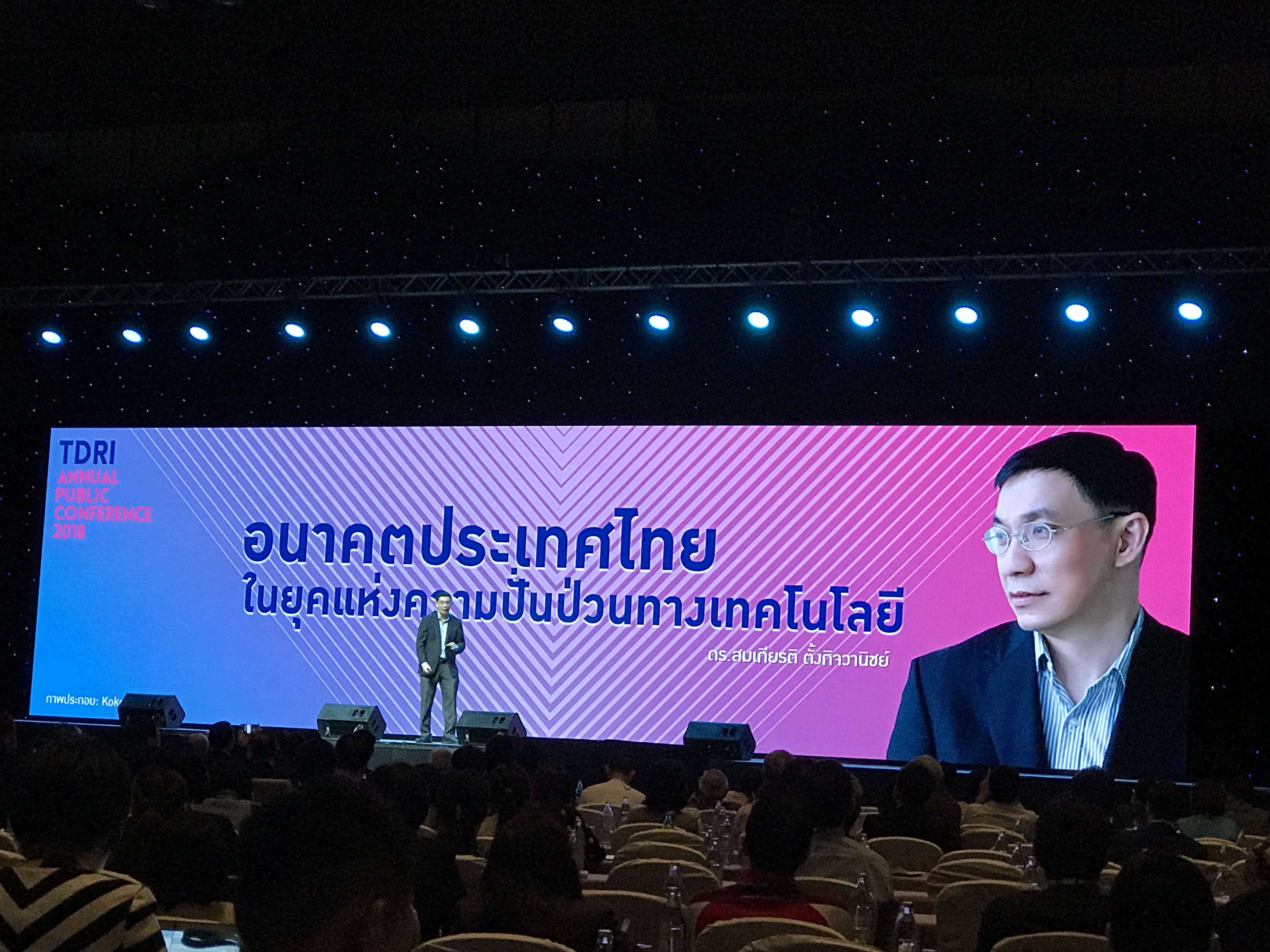 – ดร.สมเกียรติ ตั้งกิจวานิชย์ ประธานสถาบันวิจัยและพัฒนาประเทศไทย (TDRI) กล่าวในงานสัมมนาสาธารณะประจำปี 2561 ว่าขณะนี้อัตราการเติบโตทางเศรษฐกิจของไทยถือว่ายังเติบโตต่ำ และยิ่งไทยกำลังเข้าสู่สังคมผู้สูงอายุ จะส่งผลให้การเติบโตในอนาคตยิ่งต่ำลงอีก ส่วนประเทศทั่วโลกกำลังพัฒนาปัญญาประดิษฐ์ หรือ A.I. และออโตเมชันที่กำลังพัฒนาไปอย่างก้าวกระโดด จนมีความสามารถทัดเทียมหรือเกินกว่ามนุษย์ในหลายด้าน รัฐบาลประเทศต่างๆ เช่น จีน ญี่ปุ่น เกาหลีใต้ และไต้หวัน จึงได้กำหนดยุทธศาสตร์และลงทุนพัฒนาเทคโนโลยี A.I. ในขณะที่ไทยยังไม่มีการกำหนดยุทธศาสตร์นี้แล้ว หากไทยยังไม่มีการปรับตัวให้ทันต่อการเปลี่ยนแปลง จะส่งผลให้การลงทุนที่เคยมีฐานการผลิตอยู่ในไทย อาจถูกย้ายไปยังที่อื่นที่มีความพร้อมด้านเทคโนโลยีมากกว่า