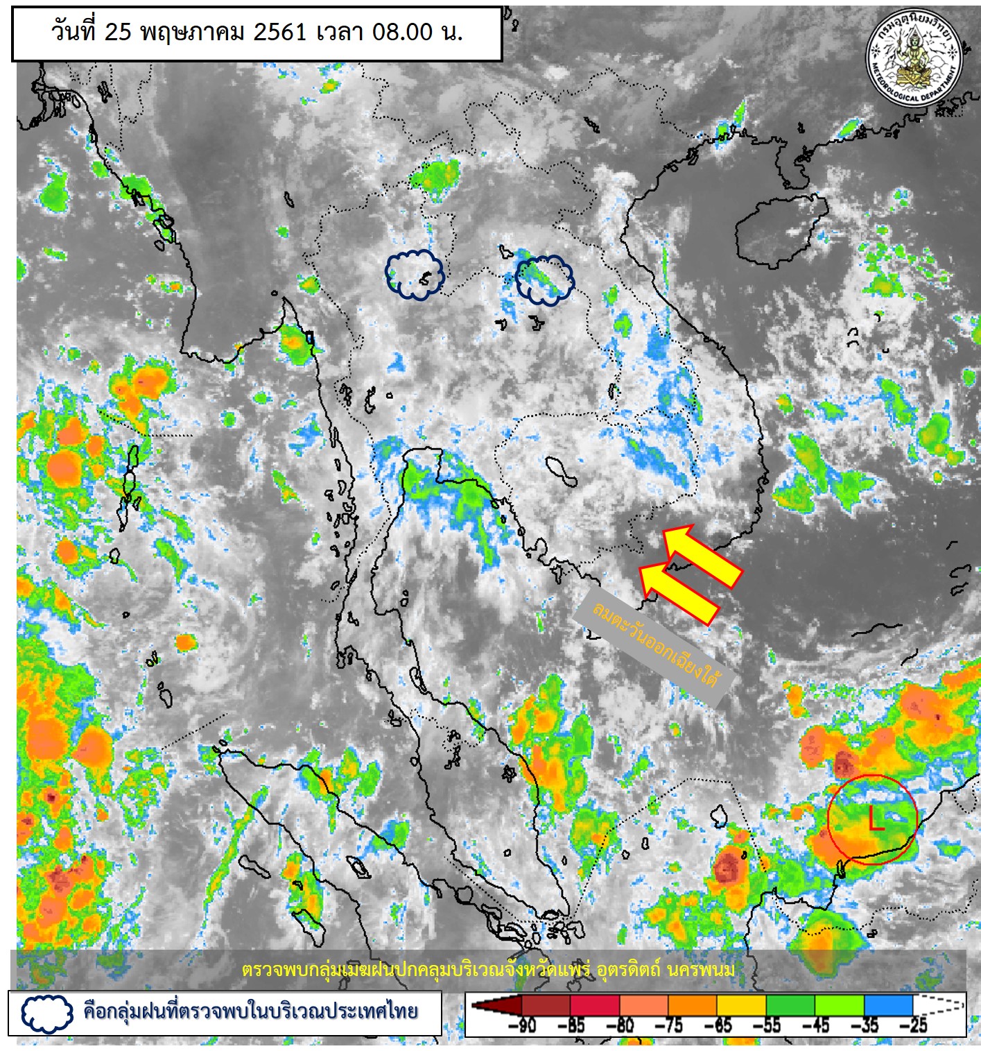 - ประเทศไทยมีฝนฟ้าคะนองหลายพื้นที่ กับมีฝนตกหนักและลมกระโชกแรงบางแห่ง ขอให้ประชาชนระวังอันตรายจากฝนฟ้าคะนอง ฝนตกหนักและฝนที่ตกสะสมไว้ด้วย