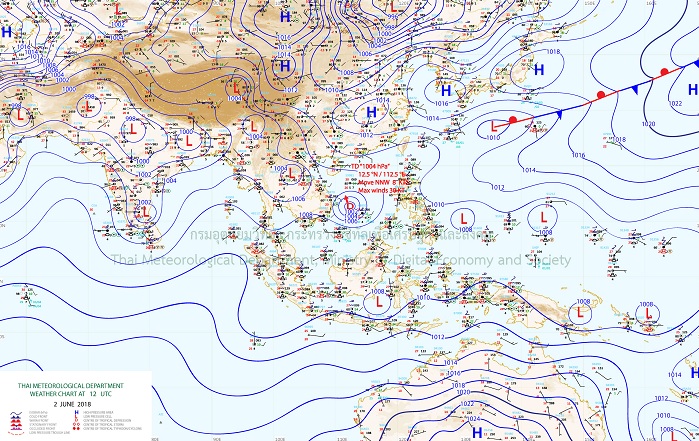 - กรมอุตุนิยมวิทยาได้ออกประกาศว่า หย่อมความกดอากาศต่ำกำลังแรงบริเวณทะเลจีนใต้ตอนกลางได้พัฒนาตัวขึ้นเป็นพายุดีเปรสชันแล้ว มีความเร็วลมสูงสุดใกล้ศูนย์กลางประมาณ 30 นอต หรือ 55 กม./ชม. พายุนี้กำลังเคลื่อนตัวทางทิศเหนือค่อนตะวันตกเล็กน้อยอย่างช้าๆ คาดว่าจะเคลื่อนตัวเข้าใกล้ชายฝั่งประเทศเวียดนาม และจะค่อยๆเคลื่อนขึ้นสู่ทะเลจีนใต้ตอนบนใกล้กับเกาะไหหลำ ประเทศจีน ในช่วงวันที่ 4-6 มิถุนายน 2561 ขอให้ผู้ที่จะเดินทางไปบริเวณประเทศเวียดนาม และเกาะไหหลำ ประเทศจีน ควรตรวจสอบสภาพอากาศก่อนเดินทางด้วย และขอให้ประชาชนติดตามข่าวพยากรณ์อากาศอย่างใกล้ชิด