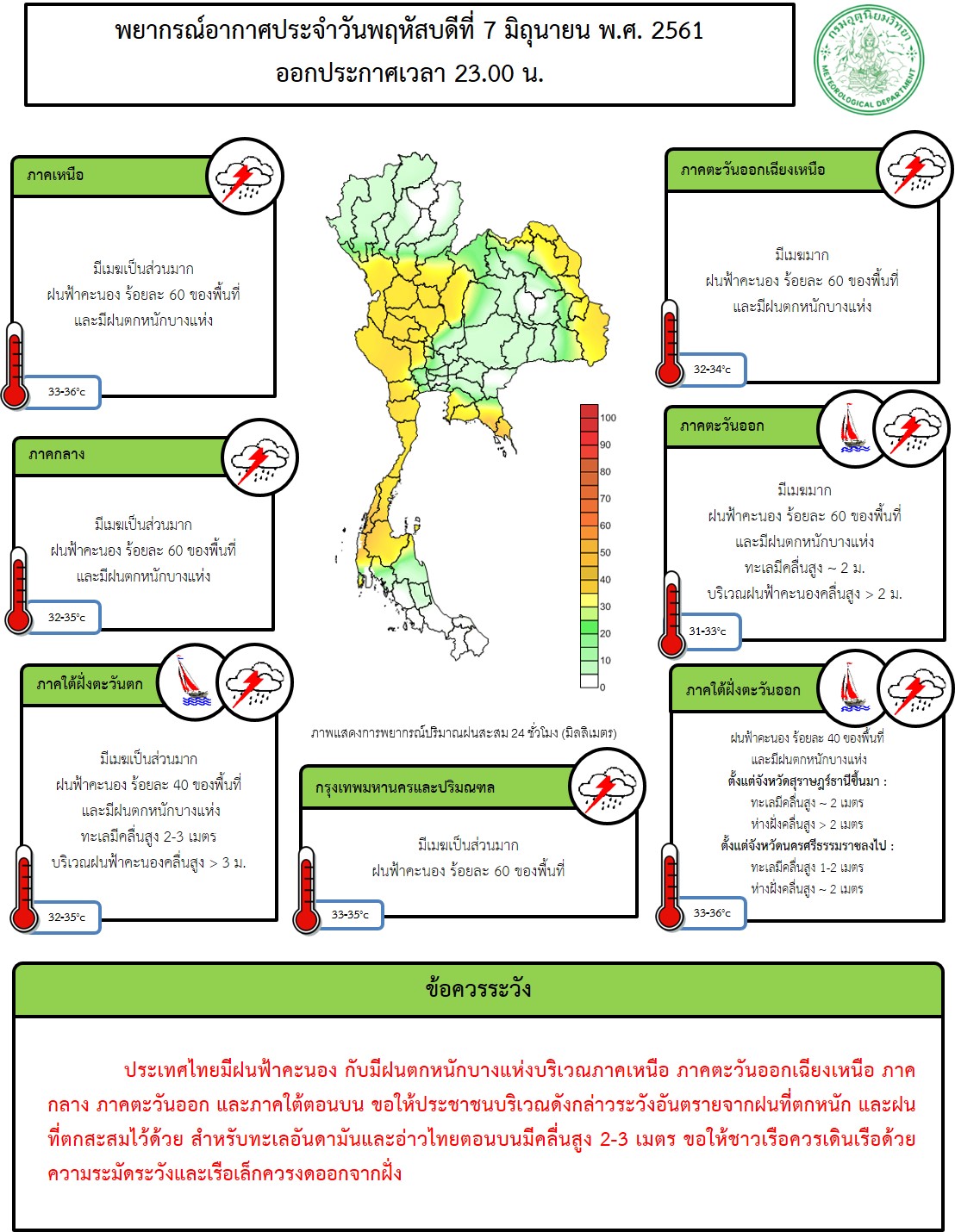 - ในช่วงวันที่ 8-11 มิ.ย. 61 มรสุมตะวันตกเฉียงใต้ที่พัดปกคลุมทะเลอันดามัน ประเทศไทย และอ่าวไทย มีกำลังแรงขึ้น ทำให้ประเทศไทยมีฝนเพิ่มมากขึ้น และมีฝนตกหนักถึงหนักมากบางแห่ง สำหรับคลื่นลมบริเวณทะเลอันดามันและอ่าวไทยตอนบนมีกำลังแรง โดยมีคลื่นสูง 2-3 เมตร ขอให้ชาวเรือเดินเรือด้วยความระมัดระวัง และเรือเล็กบริเวณทะเลอันดามันและอ่าวไทยตอนบนควรงดออกจากฝั่ง