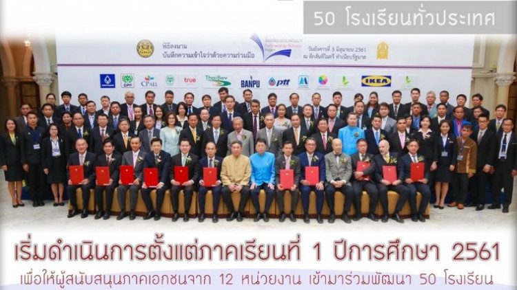 - รมว.ศธ. พร้อมด้วยผู้บริหารองค์กรหลักของ ศธ. ร่วมพิธีลงนาม MOU ว่าด้วยความร่วมมือ “โครงการโรงเรียนร่วมพัฒนา” (Partnership School Project) ระหว่าง ศธ. กับหน่วยงานผู้ให้การสนับสนุนภาคเอกชน โดยมีรอง นรม. (พล.อ.อ.ประจินฯ) เป็นประธาน และมีโรงเรียนสมัครเข้าร่วมโครงการ 50 แห่ง ซึ่งโครงการดังกล่าวจัดขึ้นเพื่อสร้างการมีส่วนร่วมของภาคส่วนต่าง ๆ ในการบริหารจัดการ ร่วมพัฒนา และสนับสนุนสถานศึกษา ภายใต้การดูแลของ ศธ. ตลอดจนเพื่อพัฒนาคุณภาพและรังสรรค์นวัตกรรมการบริหารจัดการ ที่จะเป็นการยกระดับผลสัมฤทธิ์ทางการเรียนและเตรียมความพร้อมผู้เรียนสำหรับอนาคต พร้อมทั้งพัฒนาสถานศึกษาเพื่อให้เป็นแหล่งเรียนรู้ตลอดชีวิตในชุมชน อันจะเป็นการลดความเหลื่อมล้ำได้ในที่สุด