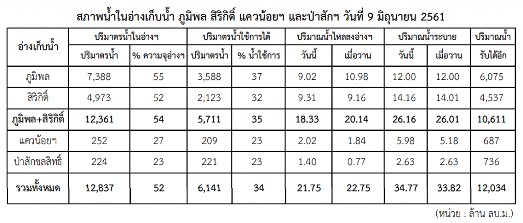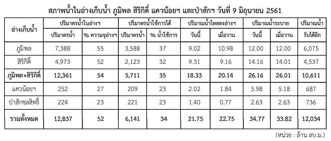 ปริมาณน้ำใช้การได้ในอ่างเก็บน้ำหลักของแม่น้ำเจ้าพระยา ได้แก่ เขื่อนภูมิพล เขื่อนสิริกิติ์ เขื่อนแควน้อยบำรุงแดน และเขื่อนป่าสักชลสิทธิ์ มีปริมาณทั้งสิ้น 6,141 ล้าน ลบ.ม. สูงกว่าวันเดียวกันของปี 2560 ถึง 1,713 ล้าน ลบ.ม. และในช่วงนี้จะพบว่ามีปริมาณน้ำไหลลงอ่างรวมประมาณ 20 ล้าน ลบ.ม. ต่อวัน ขณะที่ปริมาณน้ำระบายอยู่ที่ประมาณ 30 ล้าน ลบ.ม. ต่อวัน ซึ่งเป็นปริมาณที่ใกล้เคียงกัน ทำให้ปริมาณน้ำที่สามารถรับได้รวมทั้ง 4 เขื่อนค่อนข้างคงที่อยู่ที่ประมาณ 12,000 ล้าน ลบ.ม. เพื่อเตรียมรองรับปริมาณน้ำฝนในฤดูฝนนี้ - สถานการณ์อากาศ