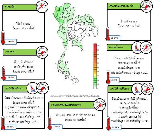 - พยากรณ์อากาศ 24 ชั่วโมงข้างหน้า ประเทศไทยมีปริมาณฝนลดลง แต่บริเวณภาคเหนือยังคงมีฝนตกมากกว่าภาคอื่น ๆ ขอให้ประชาชนบริเวณดังกล่าว ที่อาศัยอยู่ในพื้นที่เสี่ยงภัย ระวังอันตรายจากฝนที่ตกสะสมไว้ด้วย ส่วนบริเวณทะเลอันดามันมีคลื่นสูง 2-3 เมตร และบริเวณอ่าวไทยตอนบนตั้งแต่จังหวัดสุราษฎร์ธานีขึ้นมามีคลื่นสูงประมาณ 2 เมตร ขอให้ชาวเรือเดินเรือด้วยความระมัดระวังและเรือเล็กบริเวณทะเลอันดามันควรงดออกจากฝั่งตลอดช่วง ข้อควรระวัง ขอให้ประชาชนบริเวณภาคเหนือ ภาคตะวันออกเฉียงเหนือ ภาคกลาง ภาคตะวันออก และภาคใต้ตอนบน ระวังอันตรายจากฝนตกหนัก น้ำท่วมฉับพลัน น้ำป่าไหลหลาก และฝนที่ตกสะสมไว้ด้วย สำหรับชาวเรือบริเวณทะเลอันดามันและอ่าวไทยตอนบนควรเดินเรือด้วยความระมัดระวัง และเรือเล็กควรงดออกจากฝั่งตลอดช่วง