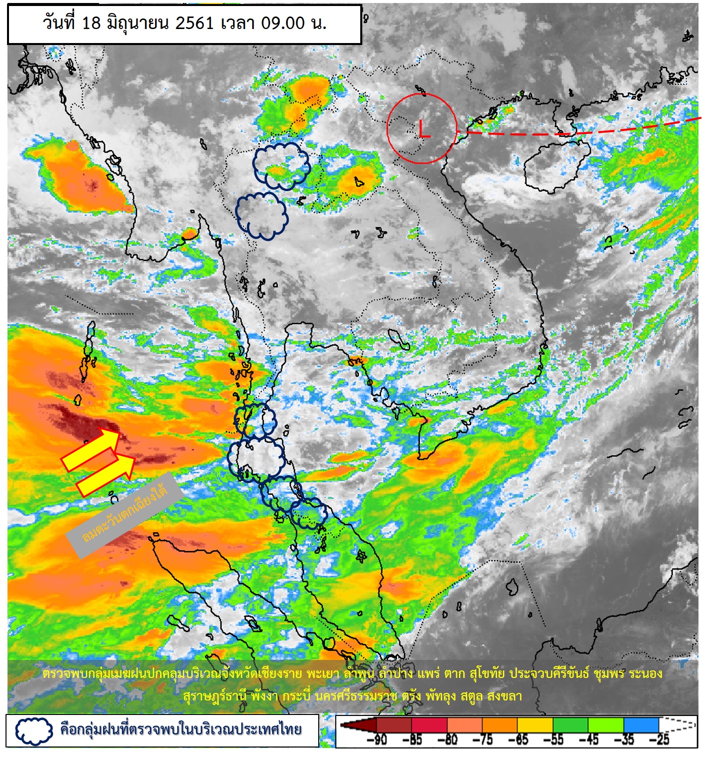 - ประเทศไทยมีฝนเพิ่มขึ้นกับมีฝนตกหนักบางแห่งบริเวณภาคเหนือ ภาคตะวันออกเฉียงเหนือ ภาคตะวันออก และภาคใต้ตอนบน ขอให้ประชาชนที่อาศัยอยู่ในพื้นที่เสี่ยงภัย ระวังอันตรายจากฝนที่ตกหนักและฝนที่ตกสะสมไว้ด้วย ส่วนคลื่นลมบริเวณทะเลอันดามันมีคลื่นสูง 2-4 เมตร และบริเวณอ่าวไทยตอนบนตั้งแต่จังหวัดสุราษฎร์ธานีขึ้นมาห่างฝั่งมีคลื่นสูง 2-3 เมตร ขอให้ชาวเรือเดินเรือด้วยความระมัดระวัง และเรือเล็กบริเวณทะเลอันดามันและอ่าวไทยควรงดออกจากฝั่ง