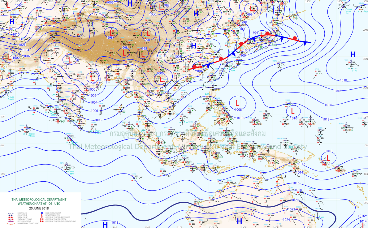 - ลักษณะสำคัญทางอุตุนิยมวิทยา ในช่วงวันที่ 21-27 มิ.ย. มรสุมตะวันตกเฉียงใต้ที่พัดปกคลุมทะเลอันดามันและ อ่าวไทยตอนบนจะมีกำลังปานกลางทำให้ประเทศไทยมีฝนลดลง แต่ยังคงมีฝนตกหนักบางแห่งบริเวณภาคเหนือ ภาคตะวันออก และภาคใต้ตอนบน สำหรับคลื่นลมบริเวณอันดามันและอ่าวไทยตอนบนมีกำลังปานกลางภาคเหนือ มีฝนฟ้าคะนองร้อยละ 40-60 ของพื้นที่ และมีฝนตกหนักบางแห่งส่วนมากทางตะวันตกของภาค ตลอดช่วง โดยมีอุณหภูมิต่ำสุดที่ 23 องศาเซลเซียส และอุณหภูมิสูงสุดที่ 36 องศาเซลเซียสภาคตะวันออกเฉียงเหนือ มีฝนฟ้าคะนองร้อยละ 30-40 ของพื้นที่ ตลอดช่วง อุณหภูมิต่ำสุดที่ 24 องศาเซลเซียส อุณหภูมิสูงสุดที่ 35 องศาเซลเซียสภาคกลาง มีฝนฟ้าคะนองร้อยละ 30-40 ของพื้นที่ ส่วนมากทางด้านตะวันตกของภาค ตลอดช่วง อุณหภูมิต่ำสุดที่ 24 องศาเซลเซียส อุณหภูมิสูงสุดที่ 37 องศาเซลเซียสภาคตะวันออก มีฝนฟ้าคะนองร้อยละ 30-40 ของพื้นที่ กับมีฝนตกหนักบางแห่ง ตลอดช่วง ทะเลมีคลื่นสูง 1-2 เมตร บริเวณที่มีฝนฟ้าคะนองคลื่นสูงมากกว่า 2 เมตร อุณหภูมิต่ำสุดที่ 26 องศาเซลเซียส อุณหภูมิสูงสุดที่ 35 องศาเซลเซียสภาคใต้ (ฝั่งตะวันออก) ในช่วงวันที่ 21-23 มิ.ย. มีฝนฟ้าคะนองร้อยละ 40-60 ของพื้นที่ ในช่วงวันที่ 24-27 มิ.ย. มีฝนฟ้าคะนองร้อยละ 30-40 ของพื้นที่ทะเลมีคลื่นสูง 1-2 เมตร ห่างฝั่งคลื่นสูงมากกว่า 2 เมตร อุณหภูมิต่ำสุดที่ 23องศาเซลเซียส อุณหภูมิสูงสุดที่ 36 องศาเซลเซียสภาคใต้ (ฝั่งตะวันตก) ในช่วงวันที่ 21-27 มิ.ย. มีฝนฟ้าคะนองร้อยละ 40-60 ของพื้นที่ โดยในช่วงวันที่ 21-22 มิ.ย.มีฝนตกหนักบางแห่งมีฝนตกหนักบางแห่งทะเลมีคลื่นสูงประมาณ 2 เมตร บริเวณที่มีฝนฟ้าคะนองคลื่นสูงมากกว่า 2 เมตร อุณหภูมิต่ำสุดที่ 23 องศาเซลเซียส อุณหภูมิสูงสุดที่ 33 องศาเซลเซียสกรุงเทพมหานครและปริมณฑล มีฝนฟ้าคะนองร้อยละ 30-40 ของพื้นที่ ตลอดช่วง อุณหภูมิต่ำสุดที่ 26 องศาเซลเซียส อุณหภูมิสูงสุดที่ 36 องศาเซลเซียส