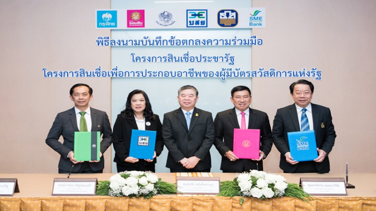 - ณ โรงแรมเซ็นทารา แกรนด์ เซ็นทรัลเวิลด์ ได้จัดพิธีลงนามบันทึกข้อตกลงความร่วมมือ โครงการสินเชื่อเพื่อการประกอบอาชีพของผู้มีบัตรสวัสดิการแห่งรัฐ ระหว่าง นางนิภารัตน์ พิสิฐพิทยเสรี รักษาการแทนผู้จัดการทั่วไป บรรษัทประกันสินเชื่ออุตสาหกรรมขนาดย่อม (บสย.) และนายอภิรมย์ สุขประเสริฐ ผู้จัดการธนาคารเพื่อการเกษตรและสหกรณ์การเกษตร (ธ.ก.ส.) เพื่อสนับสนุนเงินทุนและค้ำประกันสินเชื่อแก่ผู้มีบัตรสวัสดิการแห่งรัฐ โดยนายอภิรมย์ สุขประเสริฐ กล่าวว่า ธ.ก.ส. ได้ดำเนินงานตามมาตรการพัฒนาคุณภาพชีวิตผู้มีบัตรสวัสดิการแห่งรัฐ ซึ่ง ธ.ก.ส.จะดูแลรับผิดชอบในส่วนของเกษตรกร โดยเกษตรกรที่เข้าร่วมโครงการ 4,086,035 ราย หลังจากได้ทำการสัมภาษณ์ไปแล้วพบว่าเกษตรกรต้องการเข้ารับการพัฒนาตนเอง 2,737,439 ราย อาทิ ต้องการเสริมทักษะความรู้ทางด้านเทคโนโลยีการเกษตรและต้องการใช้สินเชื่อ เพื่อนำไปลงทุนพัฒนาอาชีพเพื่อเพิ่มรายได้ ซึ่ง ธ.ก.ส. พร้อมสนับสนุนสินเชื่อ ขณะที่ บสย.จะค้ำประกันสินเชื่อดังกล่าวให้กับเกษตรกรที่ไม่สามารถจัดหาหลักประกันตามหลักเกณฑ์ปกติได้ จึงถือได้ว่าเป็นความร่วมมือสนับสนุนเงินทุน เพื่อช่วยเหลือผู้มีบัตรสวัสดิการแห่งรัฐให้เข้าถึงแหล่งเงินทุนได้เพิ่มขึ้น อันเป็นกลไกสำคัญในการส่งเสริมการประกอบอาชีพ สร้างโอกาสและรายได้ตามมาตรการพัฒนาคุณภาพชีวิตผู้มีบัตรสวัสดิการแห่งรัฐตามนโยบายของรัฐบาลให้ประสบความสำเร็จต่อไป