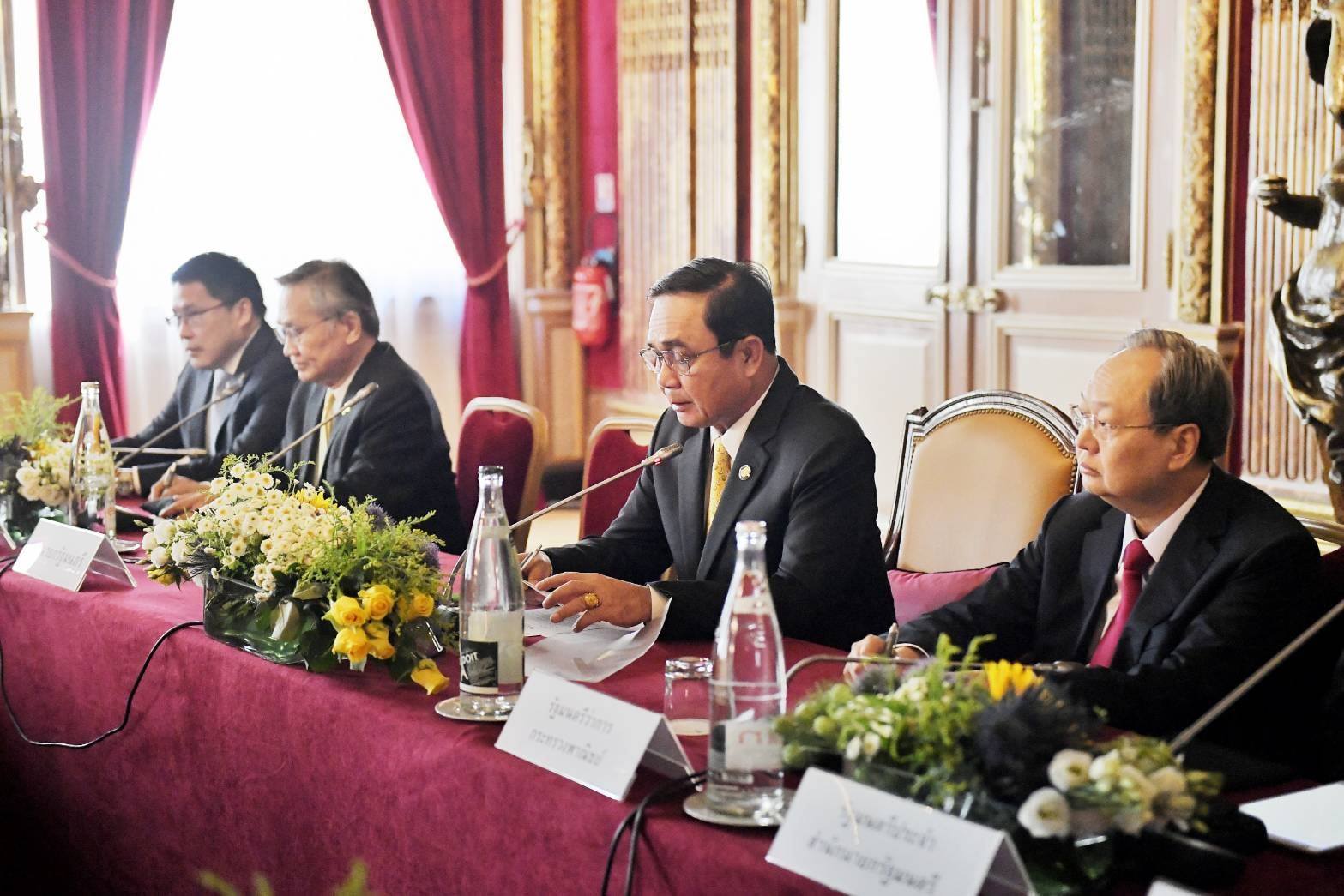 พลเอกประยุทธ์ จันทร์โอชา นายกรัฐมนตรี หารือกับคณะเอกชนไทยที่ร่วมเดินทางมาฝรั่งเศส เช่น ประธานสภาอุตสาหกรรม หอการค้านานาชาติแห่งประเทศไทย Thai Union Food Loxley มิตรผล PTT GC Sea Value Double A Michelin Siam ป่าใหญ่ครีเอชั่น และทวีบูรพา เพื่อช่วยขับเคลื่อนการค้าการลงทุนในสาธารณรัฐฝรั่งเศส ผู้แทนภาคเอกชนได้แสดงความคิดเห็นว่าฝรั่งเศสยังมีโอกาสและศักยภาพอีกหลายสาขา และภาคการลงทุนที่ฝรั่งเศสสนใจ และสอดรับกับนโยบาย Thailand 4.0 ได้แก่ เกษตรและ Bio Economy โครงสร้างพื้นฐาน Smart City พลังงานรูปแบบใหม่ การท่องเที่ยว และ Ease of Doing Business ทั้งนี้ ภาคเอกชนต่าง ๆ ต้องการให้รัฐบาลช่วยผลักดันการแก้ไขกฎหมายภาษีของฝรั่งเศสและผลักดัน FTA สินค้าเกษตร เพื่อการสนับสนุนการใช้วัตถุดิบจากไทย