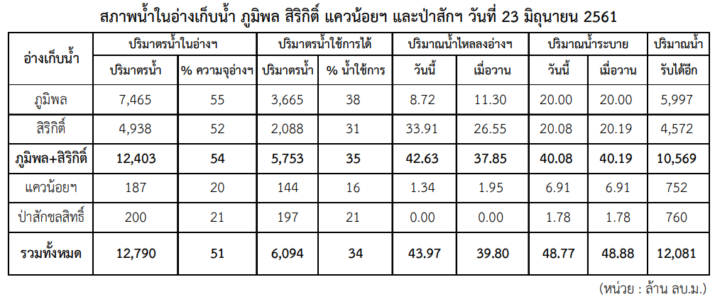 ปริมาณน้ำใช้การได้ในอ่างเก็บน้ำหลักของแม่น้ำเจ้าพระยา ได้แก่ เขื่อนภูมิพล เขื่อนสิริกิติ์ เขื่อนแควน้อยบำรุงแดน และเขื่อนป่าสักชลสิทธิ์ มีปริมาณทั้งสิ้น 6,094 ล้าน ลบ.ม. สูงกว่าวันเดียวกันของปี 2560 ถึง 1,375 ล้าน ลบ.ม. ขณะที่ปริมาณน้ำระบายปรับเพิ่มขึ้นจากสองสัปดาห์ก่อนหน้าเป็น 50 ล้าน ลบ.ม. ต่อวัน จากเดิมประมาณ 30 ล้าน ลบ.ม. ต่อวัน เนื่องจากมีปริมาณน้ำไหลลงอ่างสูงถึงวันละ 40 ล้าน ลบ.ม. ต่อวันโดยเฉลี่ยตลอดช่วงสัปดาห์ที่ผ่านมา เป็นผลมาจากปริมาณน้ำฝนจำนวนมากที่ตกในพื้นที่เหนือเขื่อน และในสัปดาห์นี้จะมีฝนตกมากในพื้นที่ภาคเหนือตอนล่าง ซึ่งจะส่งผลให้มีปริมาณน้ำไหลลงอ่างเพิ่มขึ้นในเขื่อนภูมิพลและเขื่อนสิริกิติ์