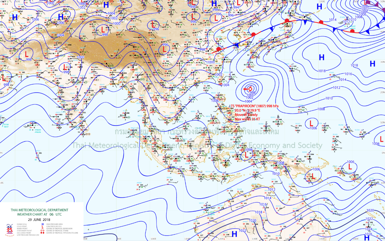 - ภาคเหนือ และภาคตะวันออกเฉียงเหนือ มีเมฆเป็นส่วนมาก กับมีฝนฟ้าคะนอง ร้อยละ 60 ของพื้นที่ และมีฝนตกหนักบางแห่ง ภาคตะวันออก มีเมฆเป็นส่วนมาก กับมีฝนฟ้าคะนอง ร้อยละ 30 ของพื้นที่ และมีฝนตกหนักบางแห่ง ภาคใต้ มีเมฆเป็นส่วนมาก กับมีฝนฟ้าคะนอง ร้อยละ 30 ของพื้นที่ ทะเลมีคลื่นสูง 1-2 เมตร บริเวณที่มีฝนฟ้าคะนองคลื่นสูงประมาณ 2 เมตร ภาคกลาง มีเมฆเป็นส่วนมาก กับมีฝนฟ้าคะนอง ร้อยละ 30 ของพื้นที่ ส่วนมากบริเวณจังหวัดกาญจนบุรี สุพรรณบุรี นครสวรรค์ อุทัยธานี ชัยนาท และราชบุรี กรุงเทพมหานครและปริมณฑล มีฝนฟ้าคะนองร้อยละ 30-40 ของพื้นที่ กับมีฝนตกหนักบางแห่ง ขอให้ประชาชนบริเวณดังกล่าวระวังอันตรายจากฝนตกหนักและฝนที่ตกสะสมไว้ด้วย อนึ่ง พายุโซนร้อน “พระพิรุณ” บริเวณมหาสมุทรแปซิฟิก มีแนวโน้มเคลื่อนตัวทางเหนือเข้าประเทศญี่ปุ่น แต่พายุนี้ไม่มีผลกระทบต่อประเทศไทย