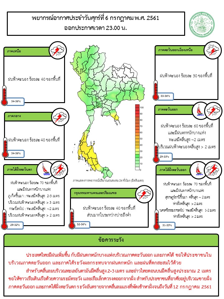 - ประเทศไทยมีฝนเพิ่มขึ้น กับมีฝนตกหนักบางแห่งบริเวณภาคตะวันออก และภาคใต้ ขอให้ประชาชนในบริเวณภาคตะวันออก และภาคใต้ระวังผลกระทบจากฝนตกหนัก และฝนที่ตกสะสมไว้ด้วย สำหรับคลื่นลมบริเวณทะเลอันดามันมีคลื่นสูง 2-3 เมตร และอ่าวไทยตอนบนมีคลื่นสูงประมาณ 2 เมตร ขอให้ชาวเรือเดินเรือด้วยความระมัดระวัง และเรือเล็กควรงดออกจากฝั่ง สำหรับประชาชนที่อาศัยอยู่บริเวณชายฝั่งภาคตะวันออก และภาคใต้ฝั่งตะวันตก ระวังอันตรายจากคลื่นลมแรงที่พัดเข้าหาฝั่งจนถึงวันที่