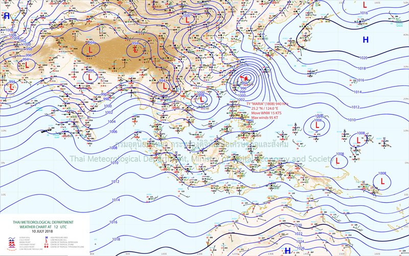 - ประเทศไทยมีฝนตกชุกหนาแน่น กับมีฝนตกหนักบางแห่งบริเวณภาคเหนือ ภาคตะวันออกเฉียงเหนือ ภาคกลาง และภาคตะวันออก ภาคใต้ฝั่งตะวันตกมีฝนตกหนักถึงหนักมากบางแห่ง ขอให้ประชาชนในบริเวณดังกล่าวระวังผลกระทบจากฝนตกหนักถึงหนักมากและฝนที่ตกสะสมไว้ด้วย ส่วนคลื่นลมบริเวณทะเลอันดามันมีคลื่นสูง 2-4 เมตร และอ่าวไทยตอนบนมีคลื่นสูง 2-3 เมตร ขอให้ชาวเรือเดินเรือด้วยความระมัดระวัง เรือเล็กควรงดออกจากฝั่ง ส่วนประชาชนที่อาศัยอยู่บริเวณชายฝั่งภาคตะวันออกและภาคใต้ฝั่งตะวันตก ระวังอันตรายจากคลื่นลมแรงที่พัดเข้าหาฝั่งจนถึงวันที่ 15 ก.ค. 61 อนึ่ง พายุไต้ฝุ่น “มาเรีย” บริเวณมหาสมุทรแปซิฟิก มีแนวโน้มเคลื่อนขึ้นฝั่งเกาะไต้หวัน และมณฑลฝูเจี้ยน ประเทศจีนในช่วงวันที่ 11-12 ก.ค. 61 แต่พายุนี้ไม่มีผลกระทบโดยตรงต่อลักษณะอากาศของประเทศไทย ขอให้ประชาชนที่จะเดินทางไปเกาะไต้หวัน และมณฑลฝูเจี้ยน ประเทศจีน ตรวจสอบสภาพอากาศก่อนออกเดินทางด้วย