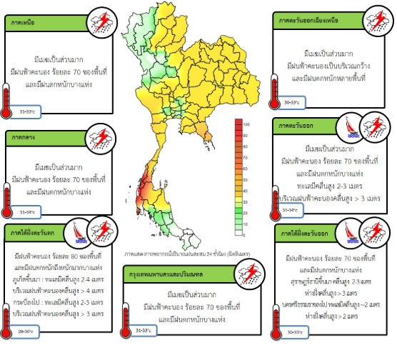- ประเทศไทยมีฝนตกชุกหนาแน่น กับมีฝนตกหนักบางแห่งบริเวณภาคเหนือ ภาคตะวันออกเฉียงเหนือ ภาคกลาง และภาคตะวันออก สำหรับภาคใต้ฝั่งตะวันตกมีฝนตกหนักถึงหนักมากบางแห่ง ขอให้ประชาชนในบริเวณดังกล่าวระวังผลกระทบจากฝนตกหนักถึงหนักมากและฝนที่ตกสะสมไว้ด้วย กรุงเทพมหานครและปริมณฑลมีเมฆเป็นส่วนมาก กับมีฝนฟ้าคะนอง ร้อยละ 70 ของพื้นที่ และมีฝนตกหนักบางแห่ง